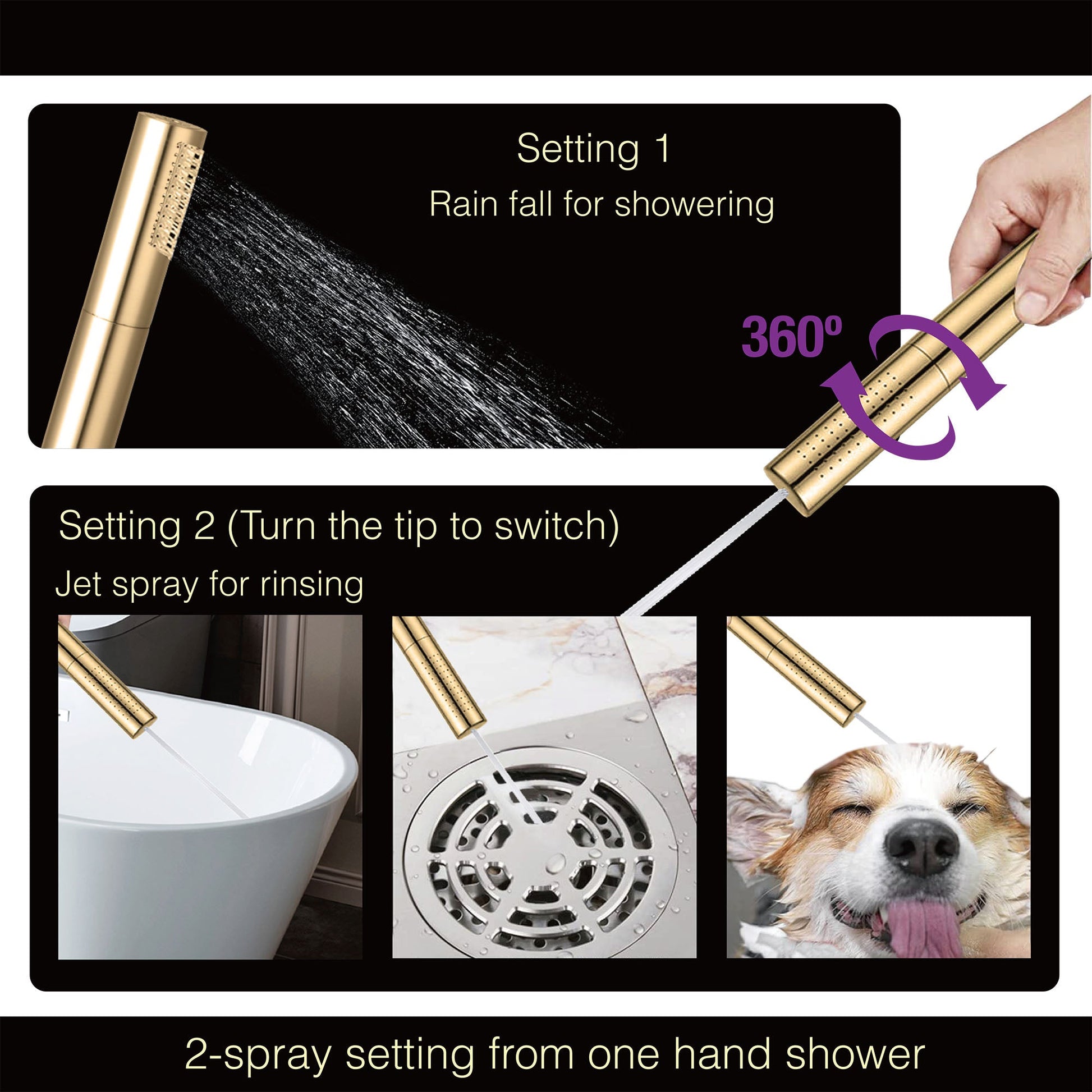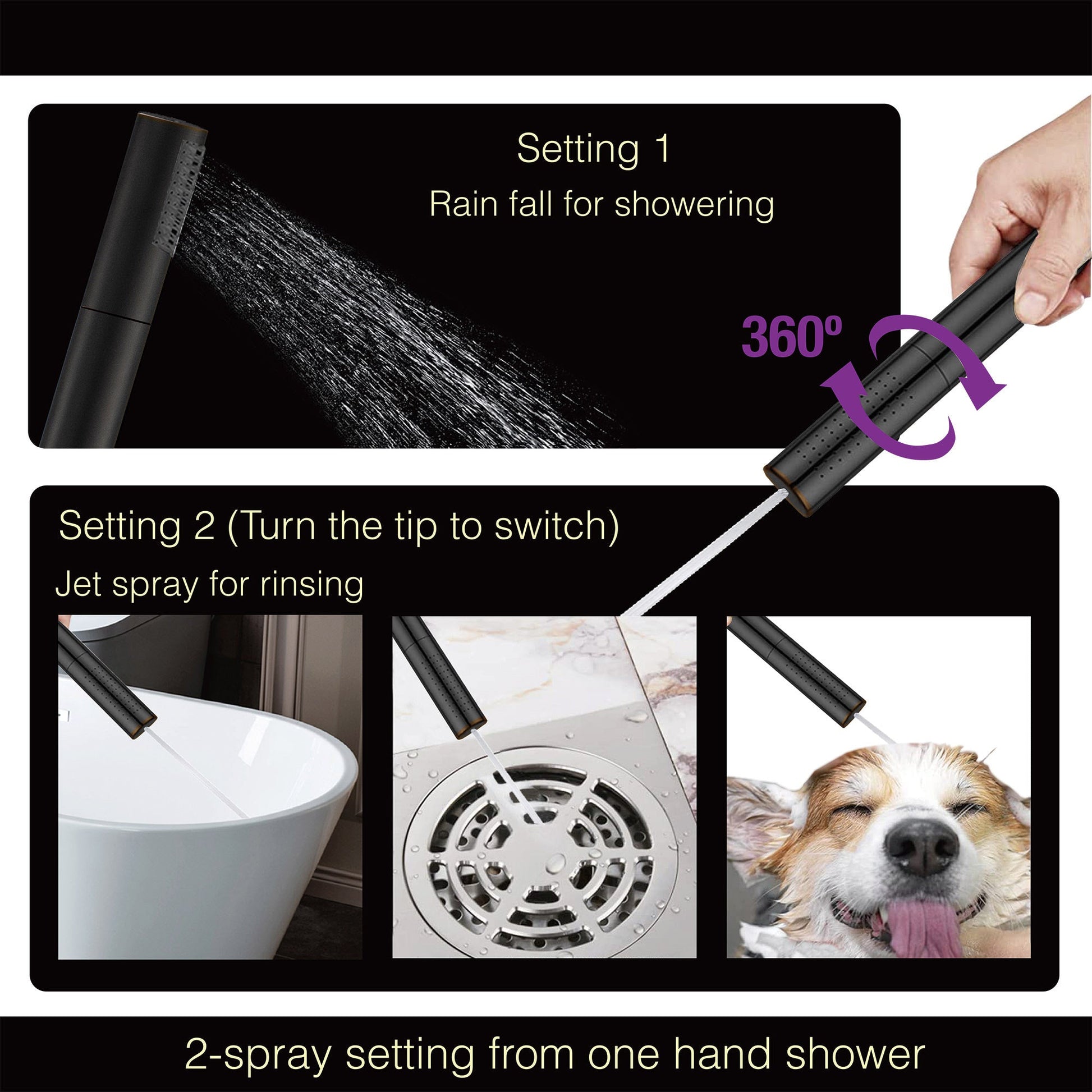 ? [HANDSHOWER AND HOSE]: Contemporary and comfortable round wand hand shower with dual spray pattern - normal spray and jet spray setting depending on your needs, The Jet type can be switched easily using rotatable spray setting, matching 60-inch shower hose makes rinsing down the tub or rinsing off after the bath much easier than ever.