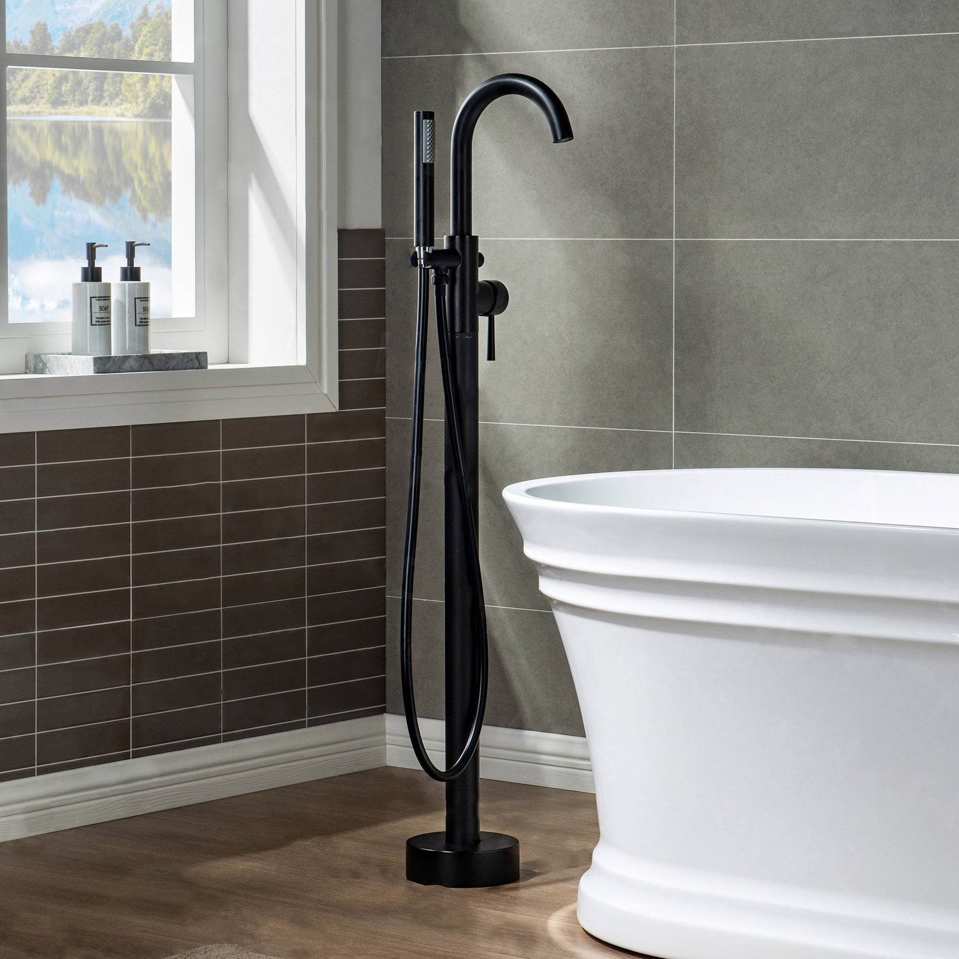 WOODBRIDGE F0001BNRD Contemporary Single Handle Floor Mount Freestanding Tub Filler Faucet with Hand shower