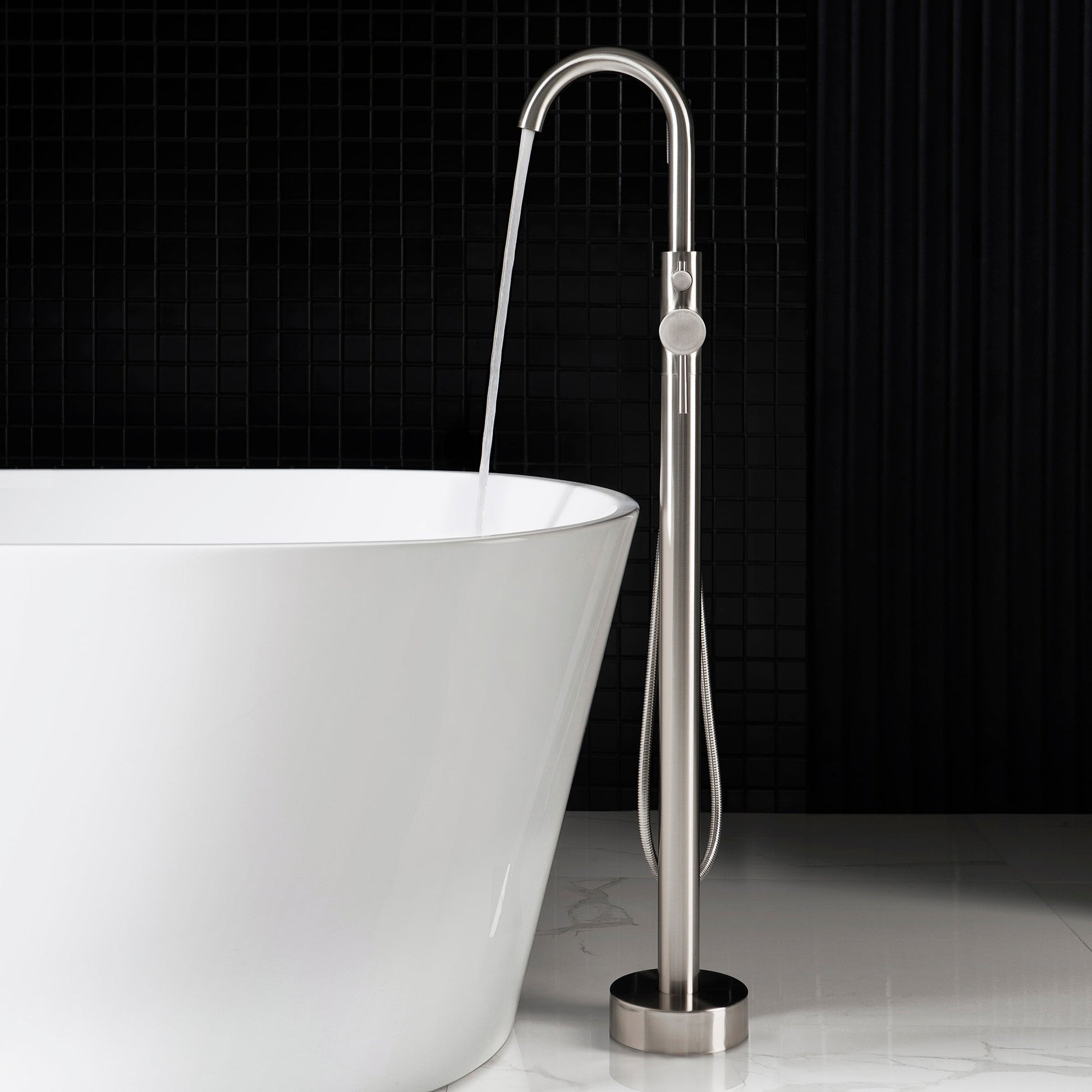 ? [DESIGN INSPIRATION]: Quick freestanding mount to floor design with high and rigid tripod mounting bracket and hardware included. Easy operation single handle design allows flow rate and temperature control in single hand. High Arch 360 Degree Swivel Spout.