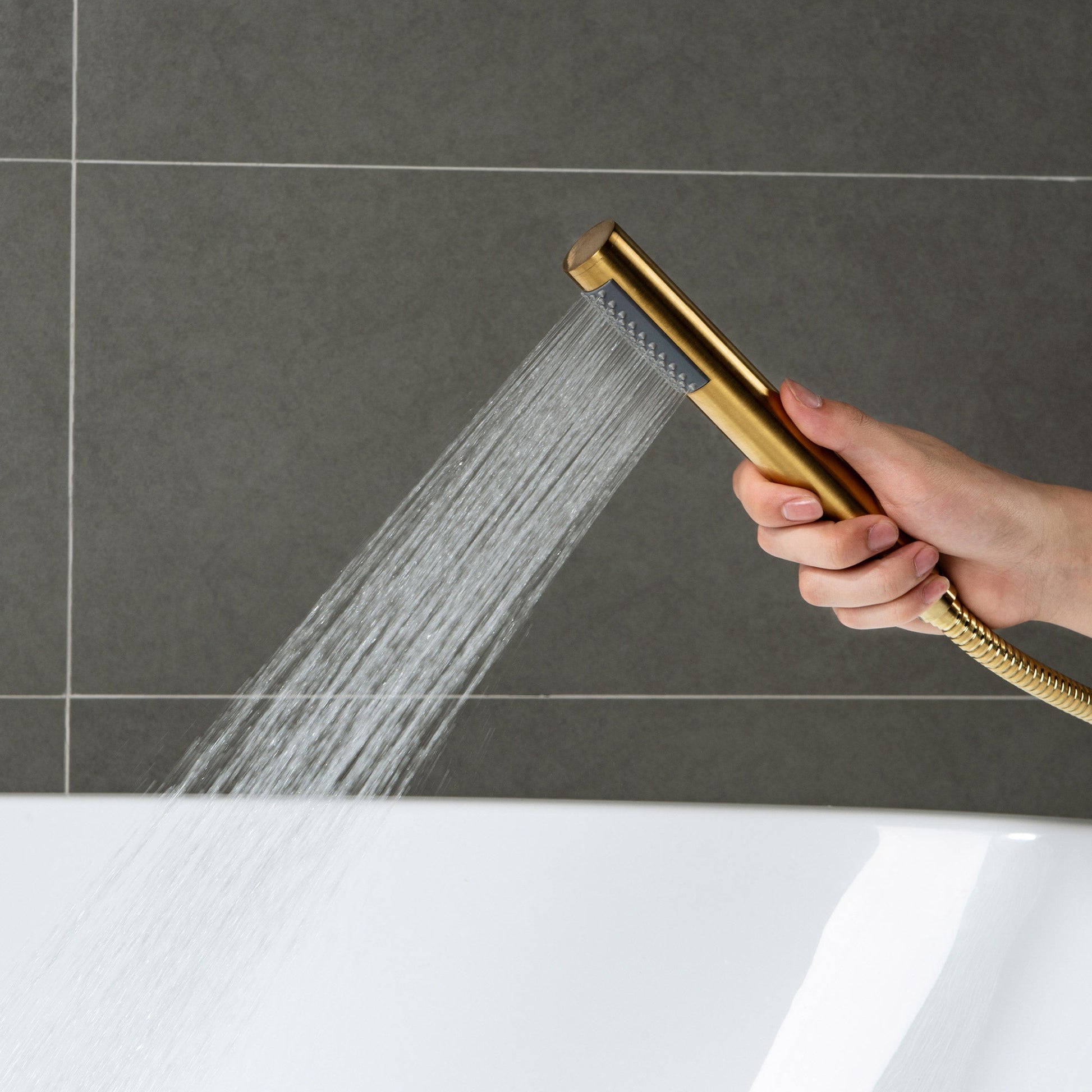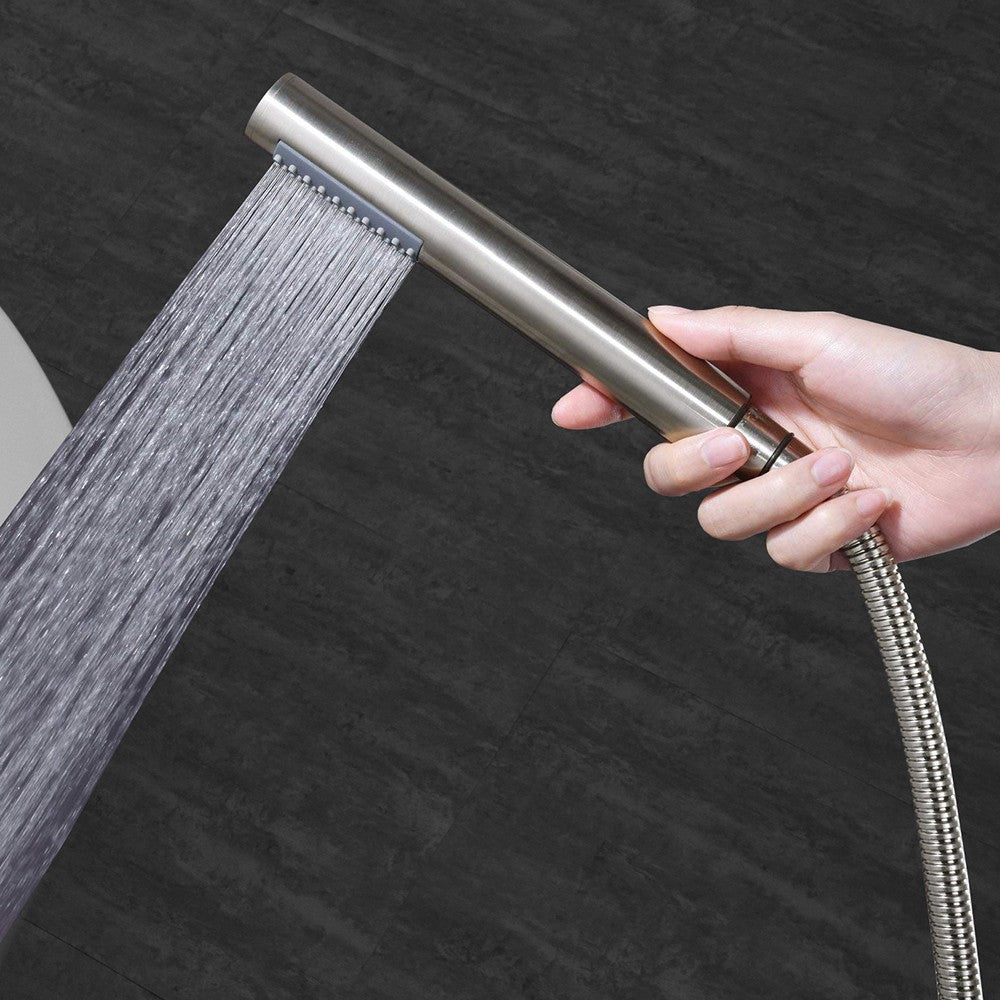 ? [HANDSHOWER AND HOSE]: Contemporary and comfortable round wand hand shower with 67 clogged free nozzles is equip with a matching 60-inch double spiral stainless steel shower hose for rinsing down the tub or rinsing off after the bath.