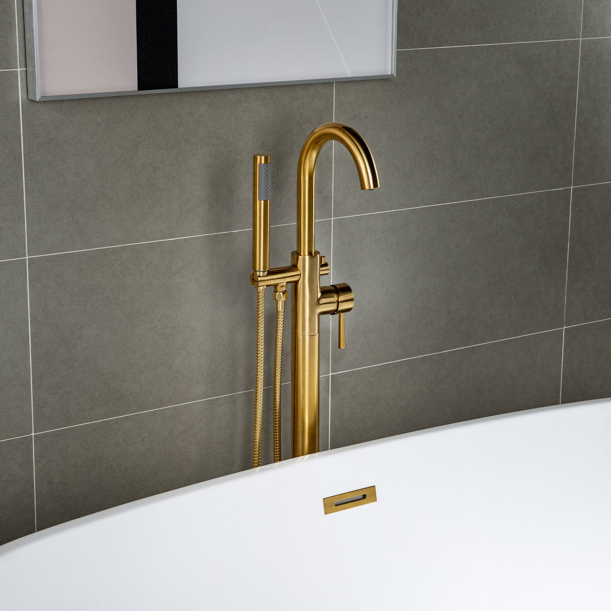 ? [PACKAGE CONTENT]: Contain bathtub faucet (crafted from high quality brass), brass tube, hand shower with 60" double spiral stainless steel hose, 32" Hot and Cold water inlet hoses, metal tripod with mounting hardware, Base Cover and installation instruction.