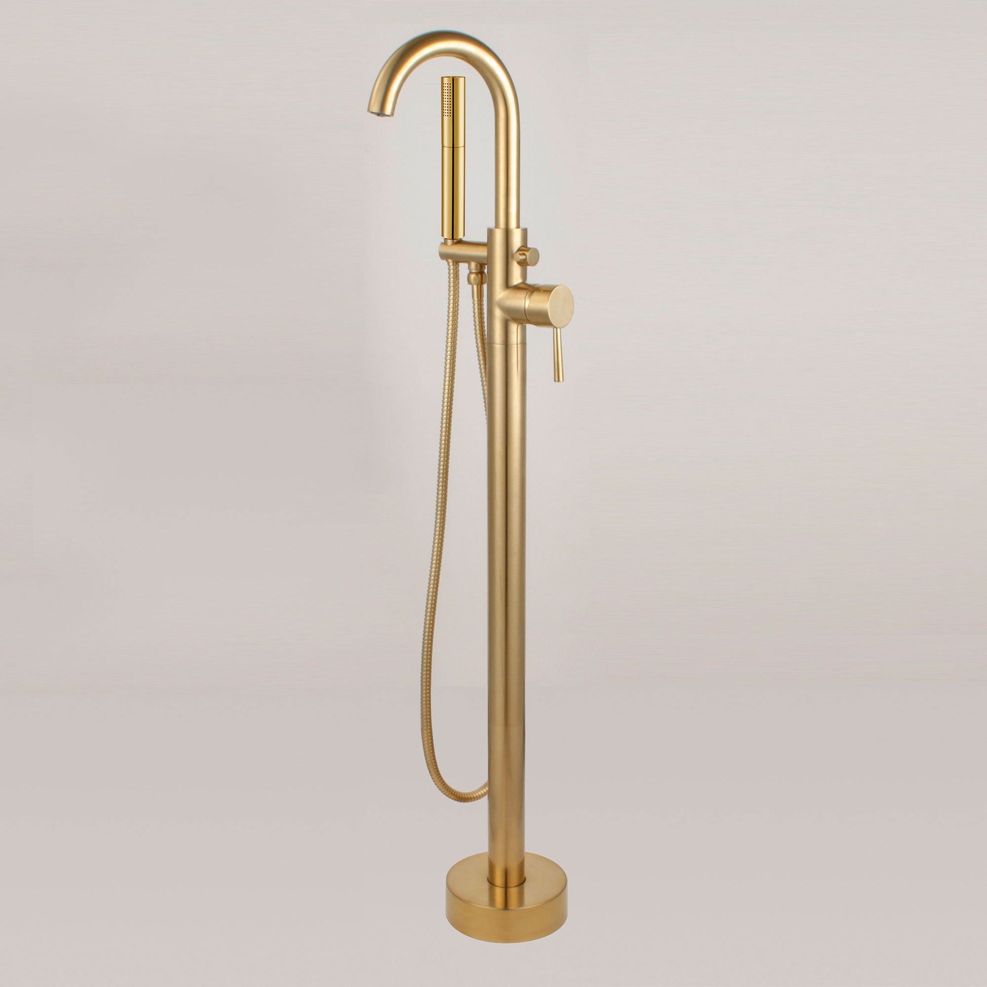 [ PACKAGE CONTENT]: Package includes bathtub faucet (crafted from high quality brass), brass tube, hand shower with 60" double spiral stainless steel hose, 32" Hot and Cold water inlet hoses, metal tripod with mounting hardware, base cover and installation instruction.