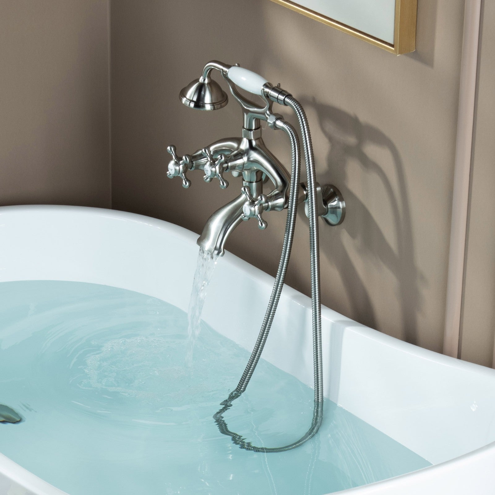 WOODBRIDGE F0030BN Wall Mount Adjustable Centers Bathtub Faucet with 3 Metal Cross Handles and Telephone Style Hand Shower and Porcelain Handle