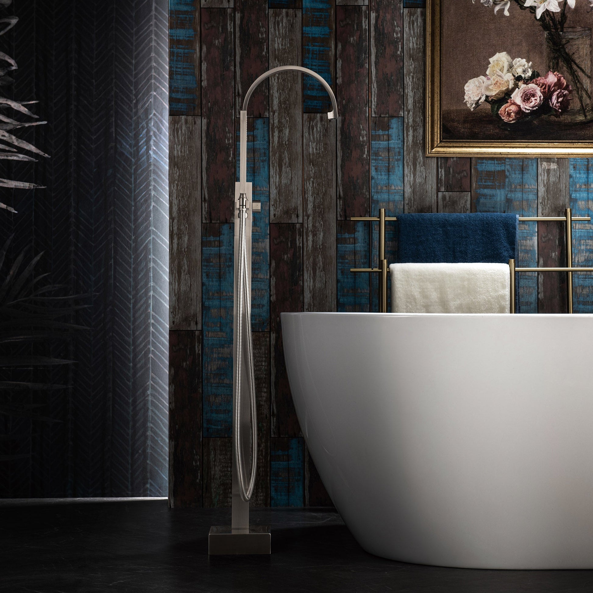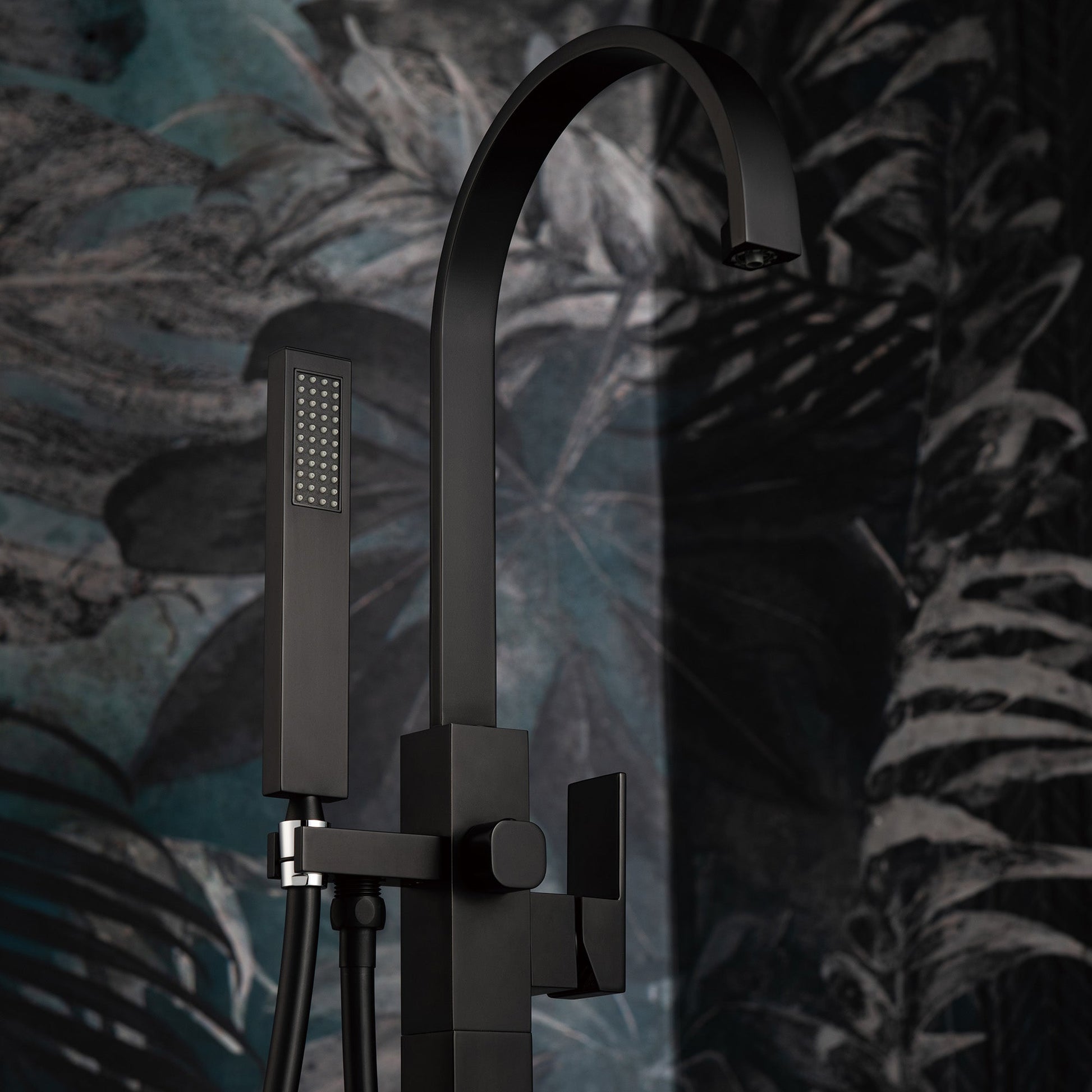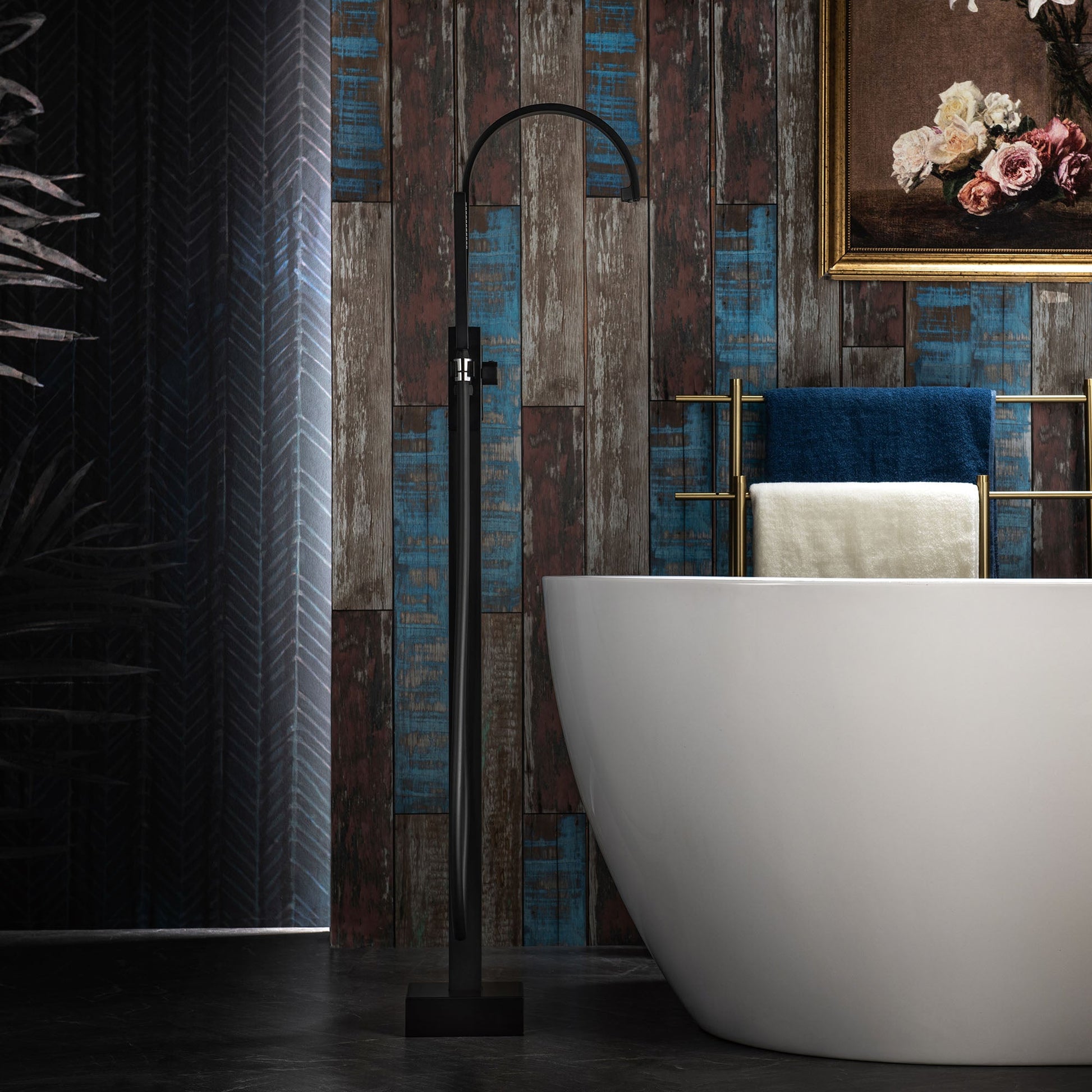 [DESIGN INSPIRATION]: Quick freestanding mount to floor design, easy operation single handle design allows flow rate and temperature control in single hand. Low arch 360 degree rotation swivel spout offers more room for bathing activities.