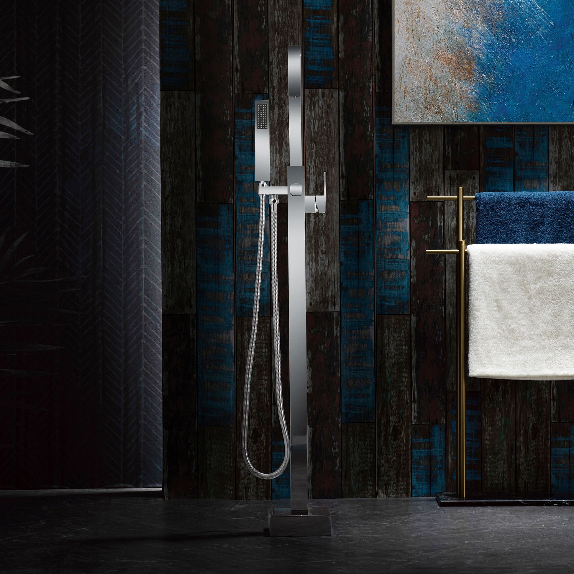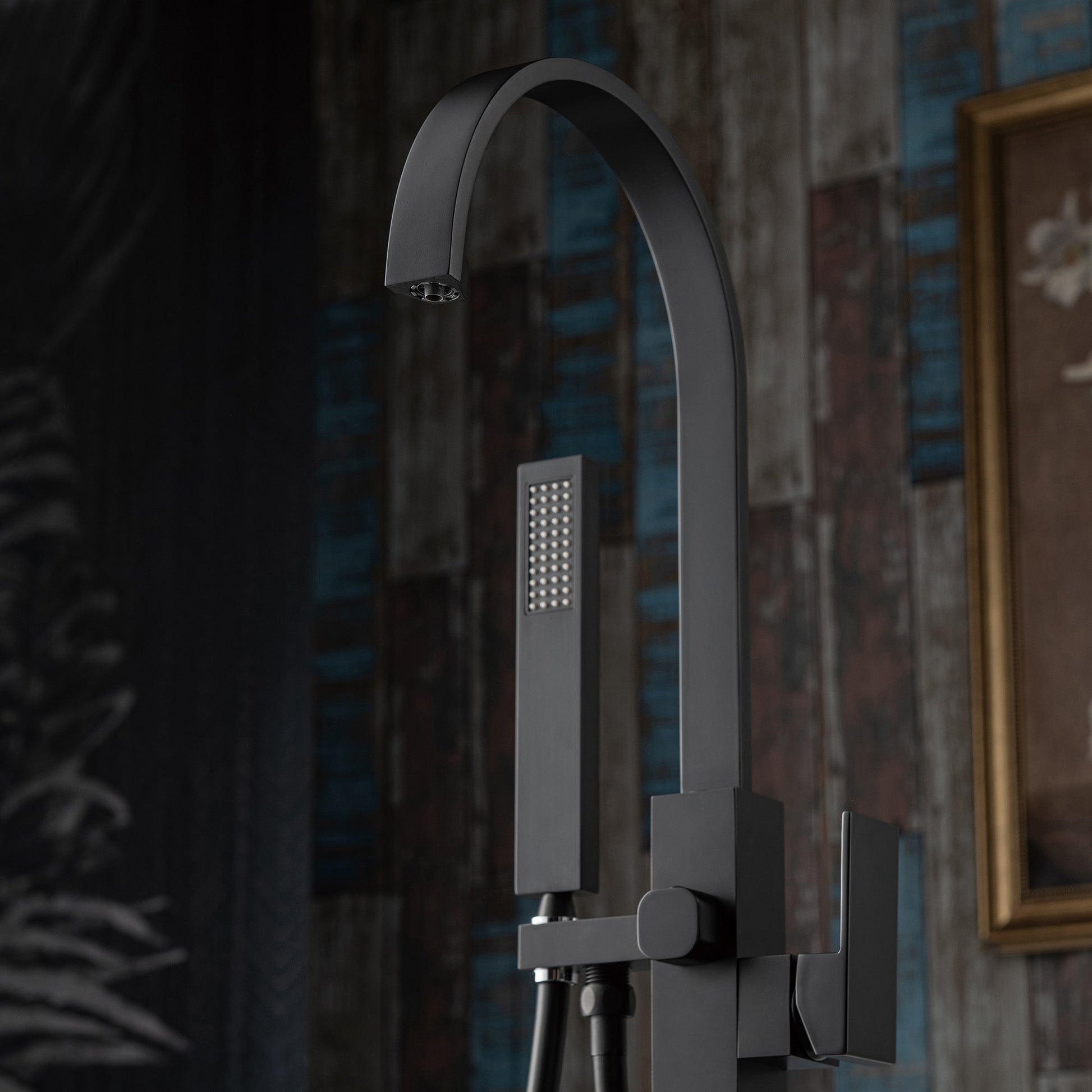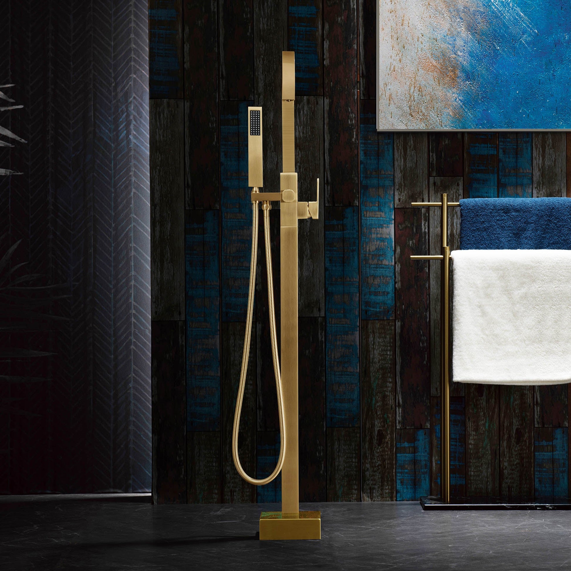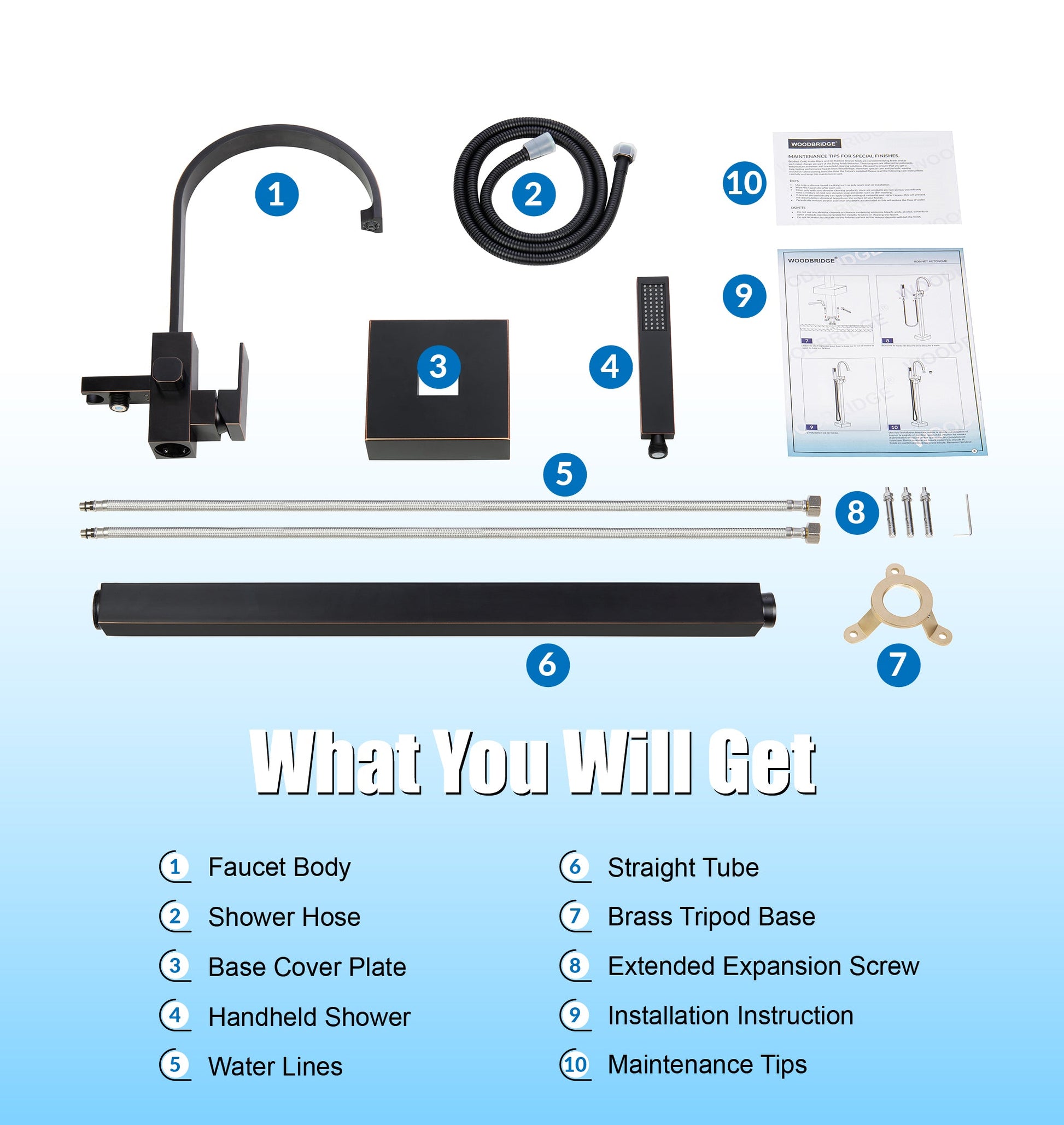 ? [PACKAGE CONTENT]: Contain bathtub faucet (crafted from solid brass), brass tube, hand shower with double spiral stainless steel hose, Hot and Cold water inlet hoses, metal tripod with mounting hardware, Base Cover and installation instruction.