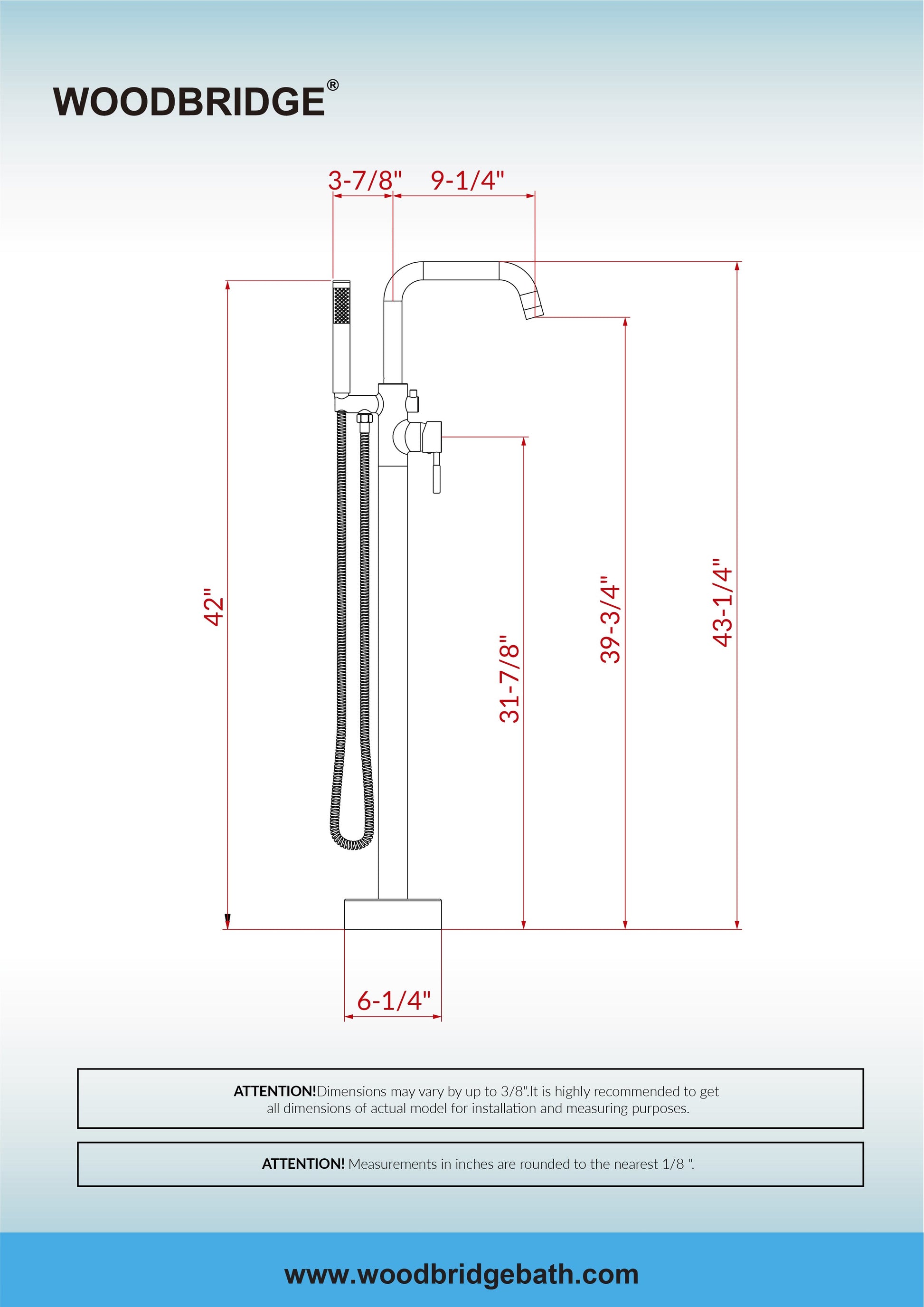 ? [PACKAGE CONTENT]: Package includes bathtub faucet, brass tube, hand shower with 60" double spiral stainless steel hose, 35" Hot and Cold water inlet hoses, metal tripod with mounting hardware, base cover and installation instruction.