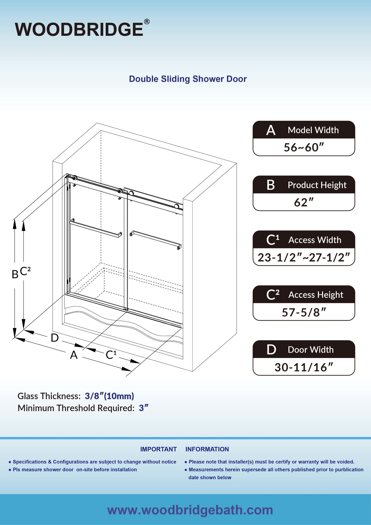 WOODBRIDGE Frameless Bathtub Shower Doors 56-60" Width x 62"Height with 3/8"(10mm) Clear Tempered Glass, 2 Ways Opening & Double Sliding