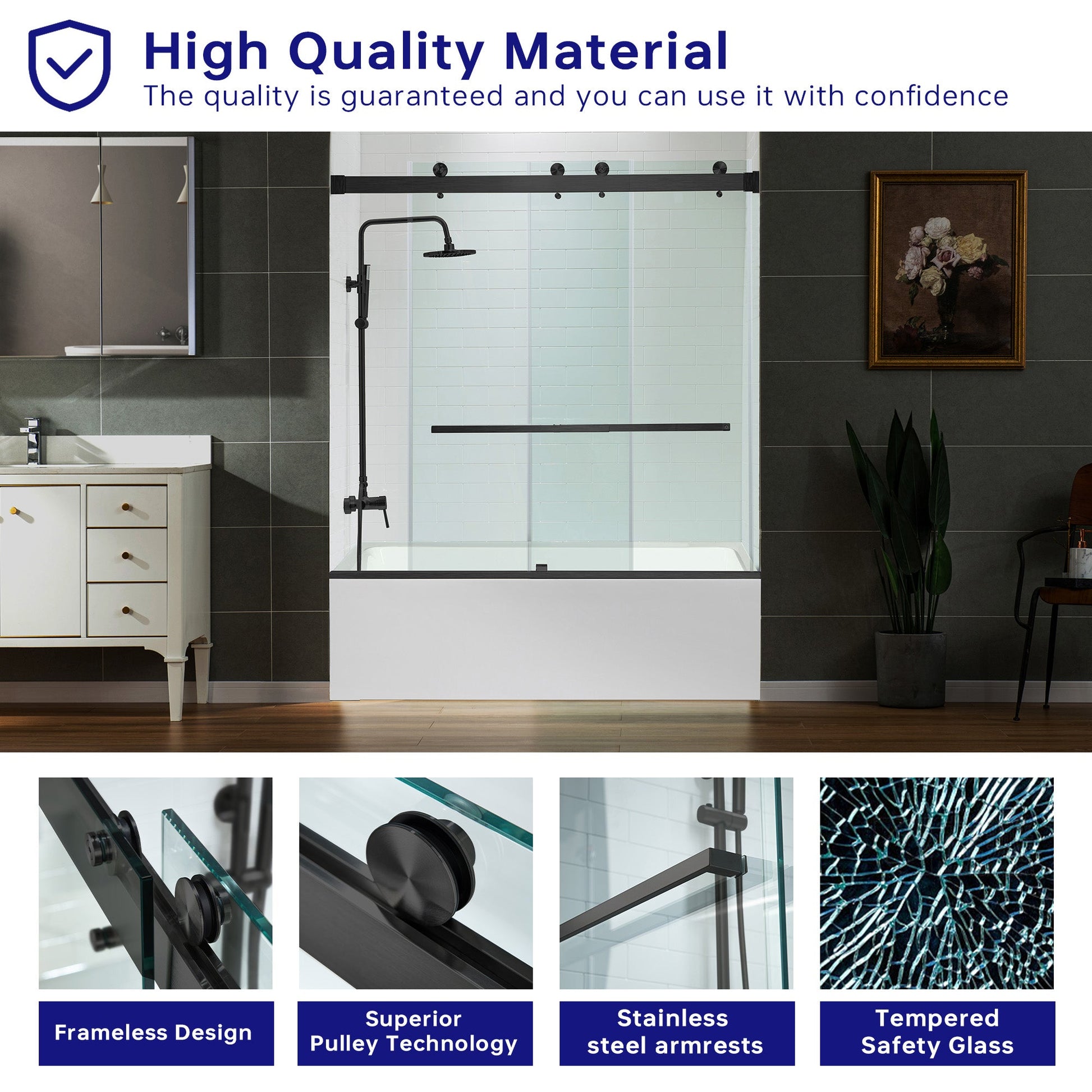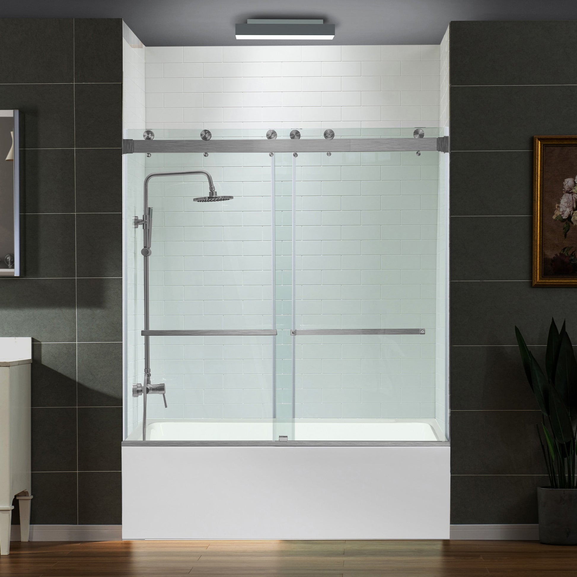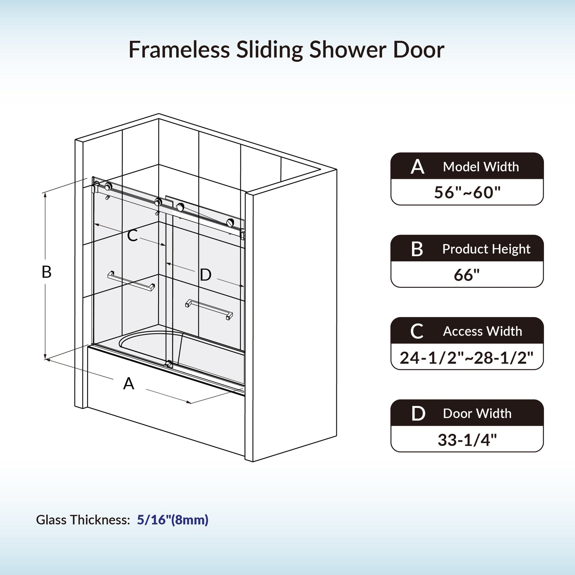 WOODBRIDGE Frameless Bathtub Shower Doors 56-60" Width x 66" Height with 5/16"(8mm) Clear Tempered Glass, Double Sliding with Side Seal Strips