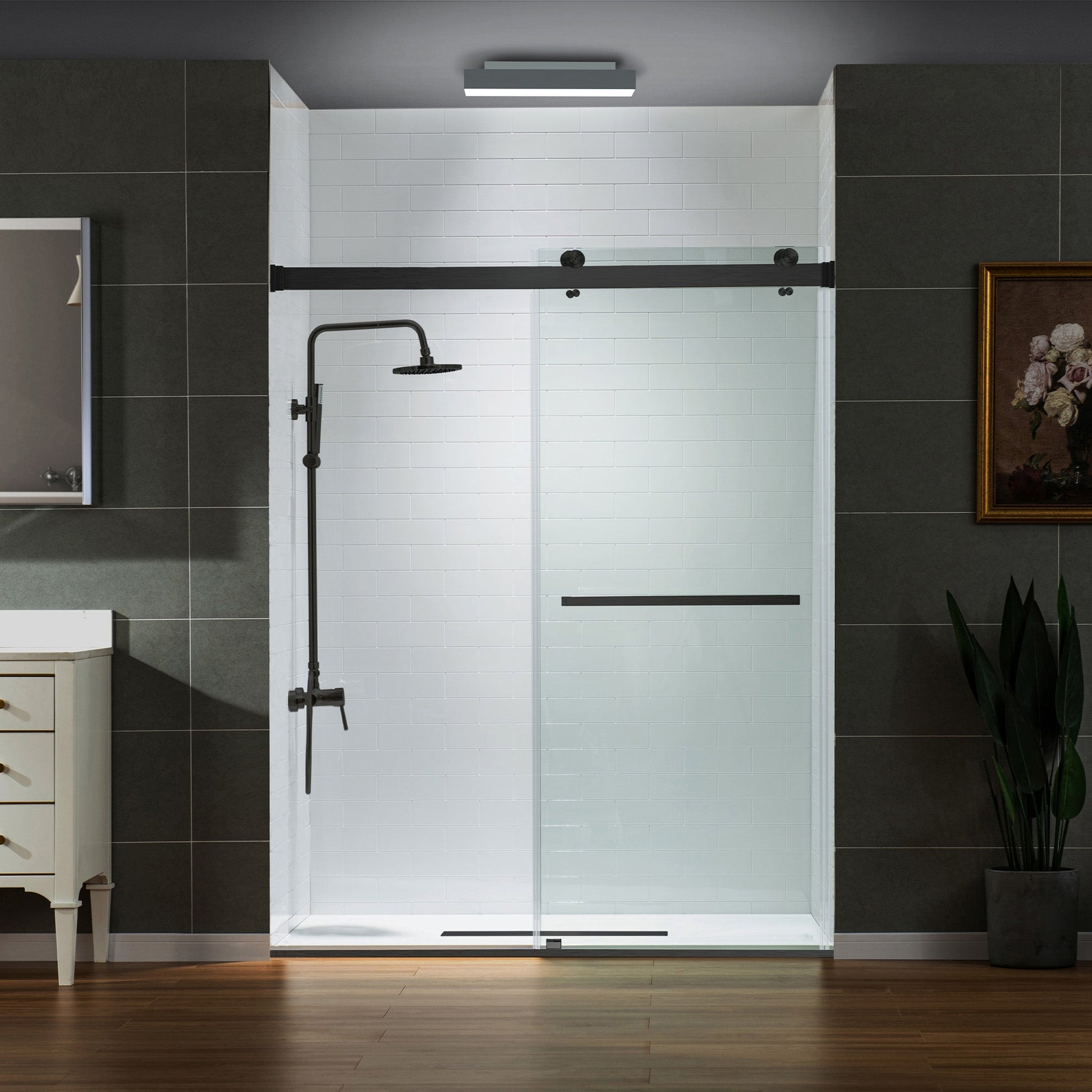 [HIGH QUALITY MATERIAL]: 5/16"(8mm) thick tempered safety glass with ANSI Z97.1 certified, for easy cleaning and to resist water spots; Large solid stainless steel rollers creating a quiet, smooth and effortless sliding.