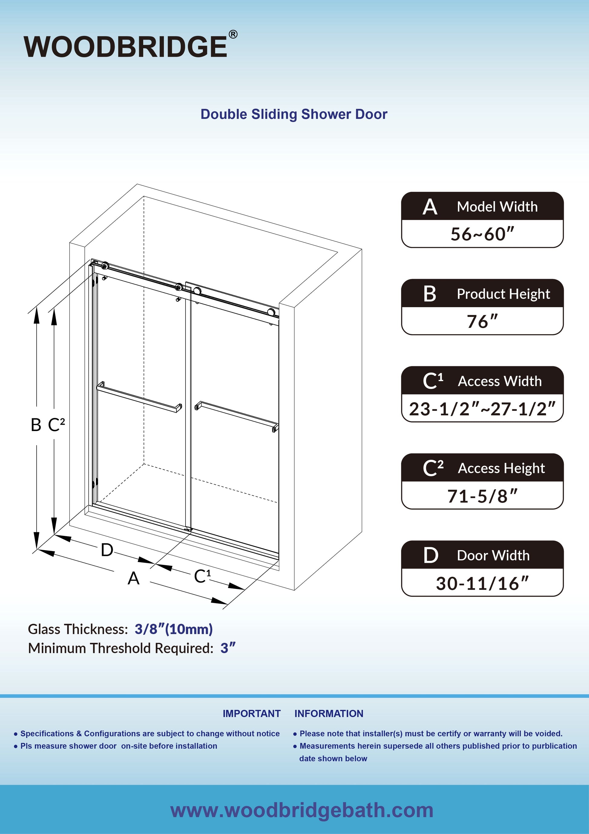 WOODBRIDGE Frameless Shower Doors 56-60" Width x 76"Height with 3/8"(10mm) Clear Tempered Glass, 2 Ways Opening & Double Sliding