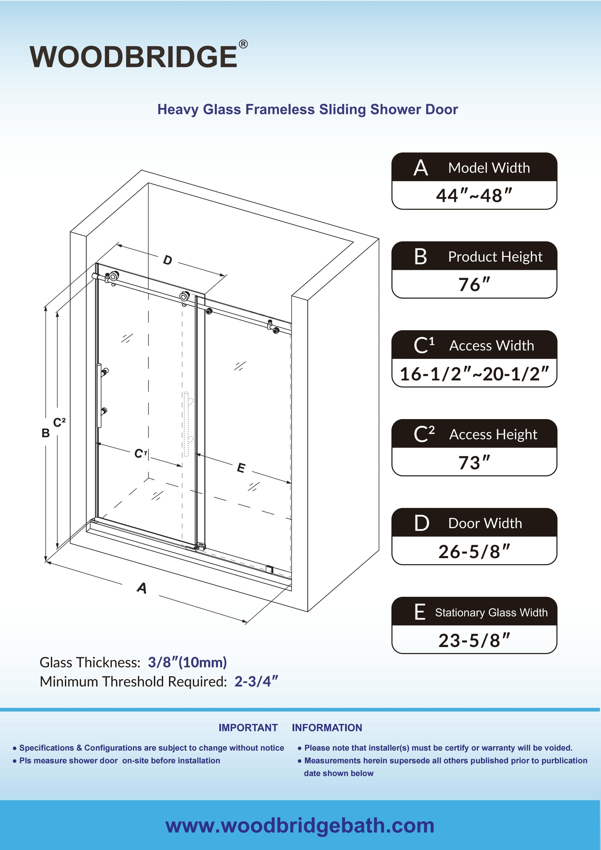 WOODBRIDGE MBSDC4876-B Frameless Shower Doors 44-48" Width x 76"Height with 3/8"(10mm) Clear Tempered Glass