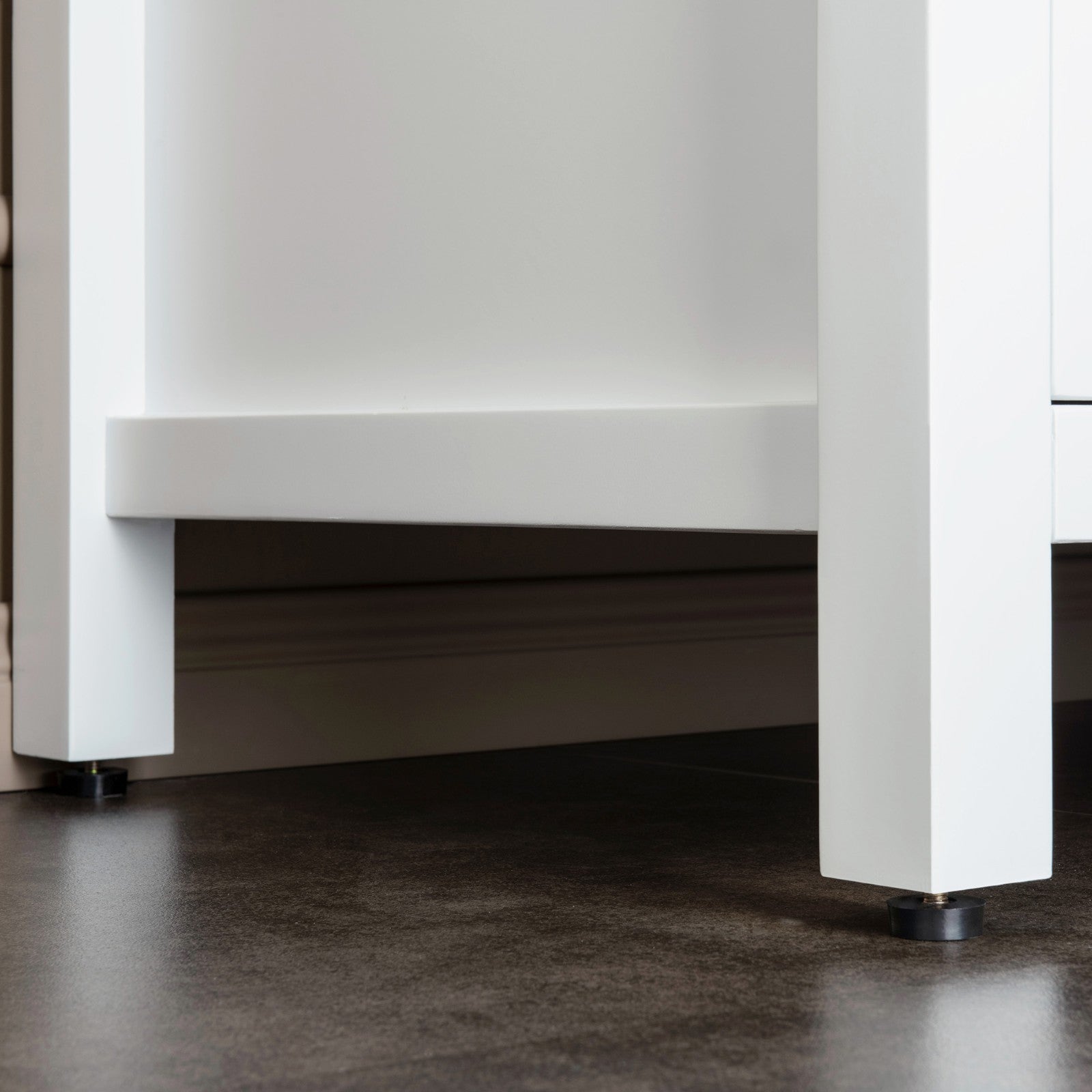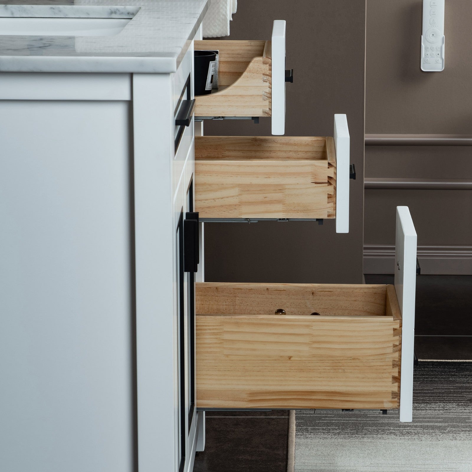 ? [RELIABLE and PERFORMANCE]: Soft-closing hinges and slides on drawers and door ensures to open and close your cabinet in quiet without noise, preventing damage to the sides around it. Dovetail jointed drawers with undercount slide; Black door knobs a perfect match to contemporary bathroom decor. Inside and outside of the cabinet are painted with matching finish of high-quality low-odor paint in layers.