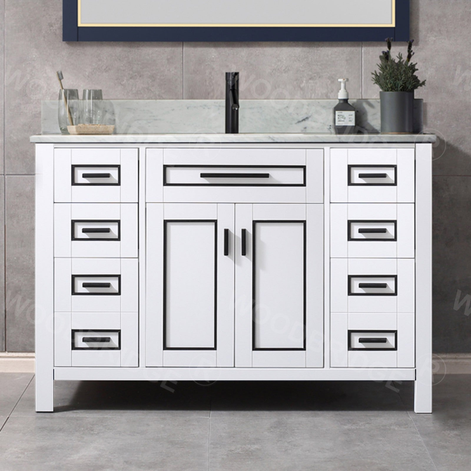 ? [RELIABLE and PERFORMANCE]: Soft-closing hinges and slides on drawers and door ensures to open and close your cabinet in quiet without noise, preventing damage to the sides around it. Dovetail jointed drawers with undercount slide; Black door knobs a perfect match to contemporary bathroom decor. Inside and outside of the cabinet are painted with matching finish of high-quality low-odor paint in layers.