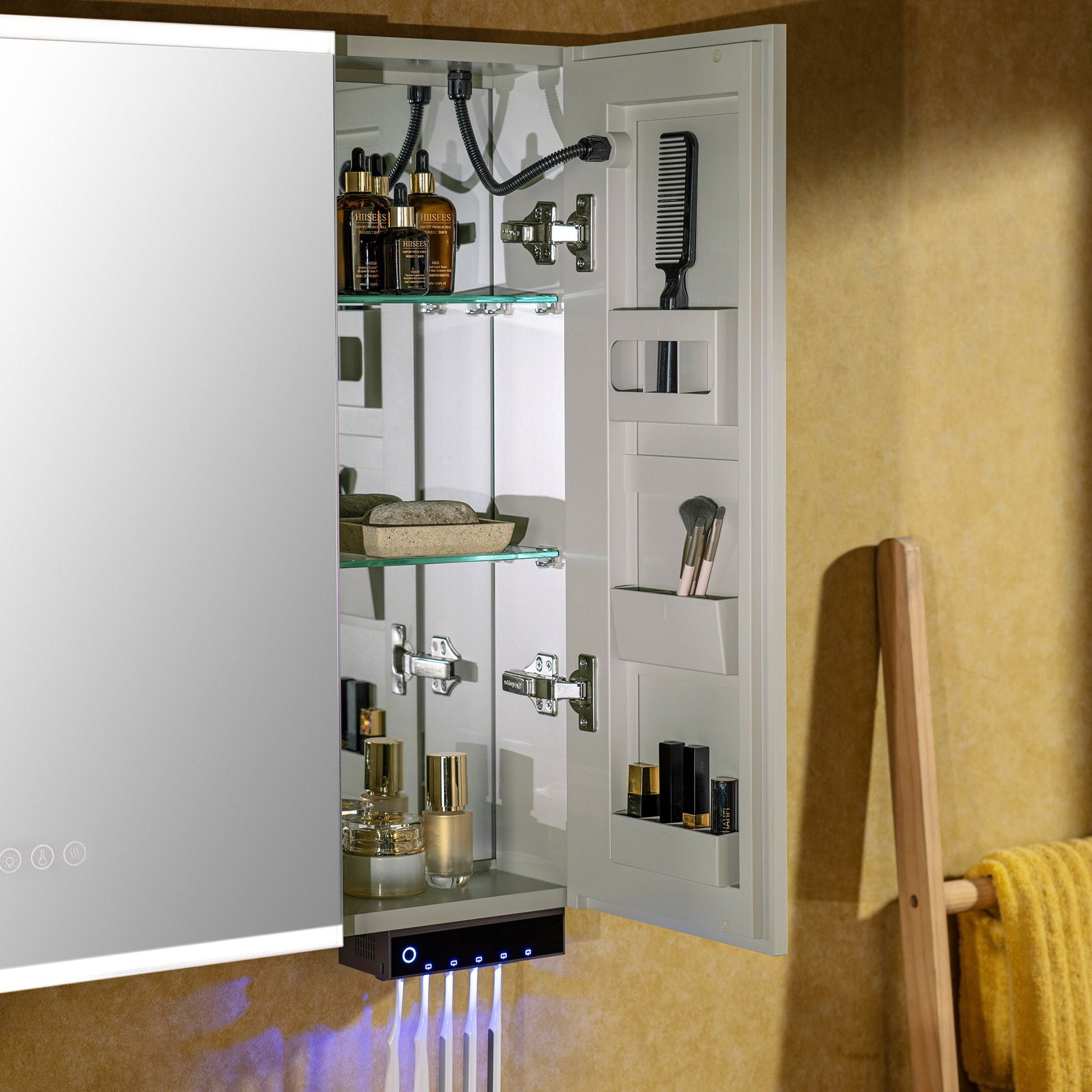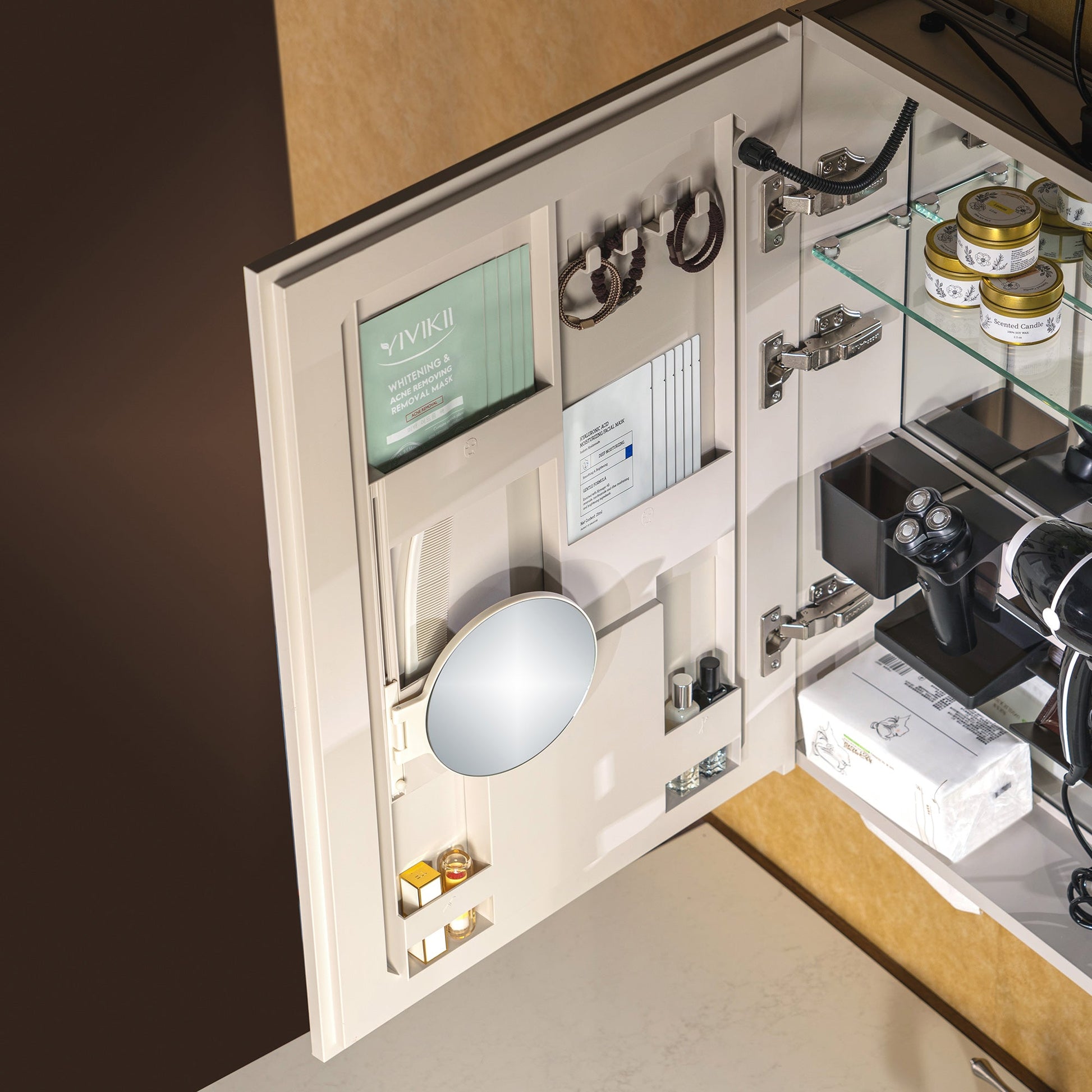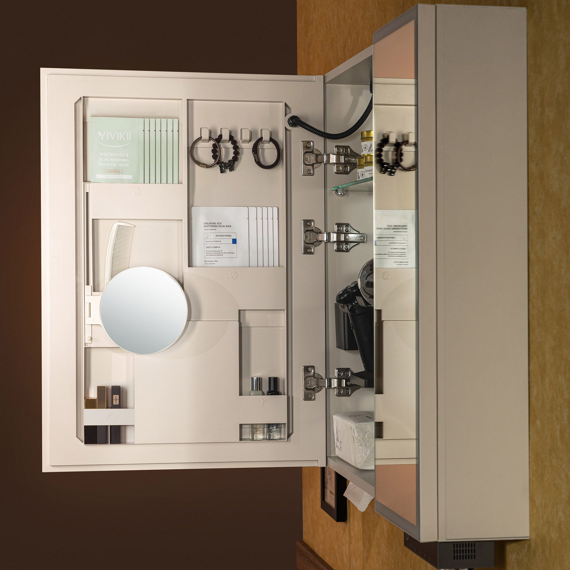 ? [DEDICATED STORAGE ZONES]: Specific areas for makeup, brushes, and jewelry.