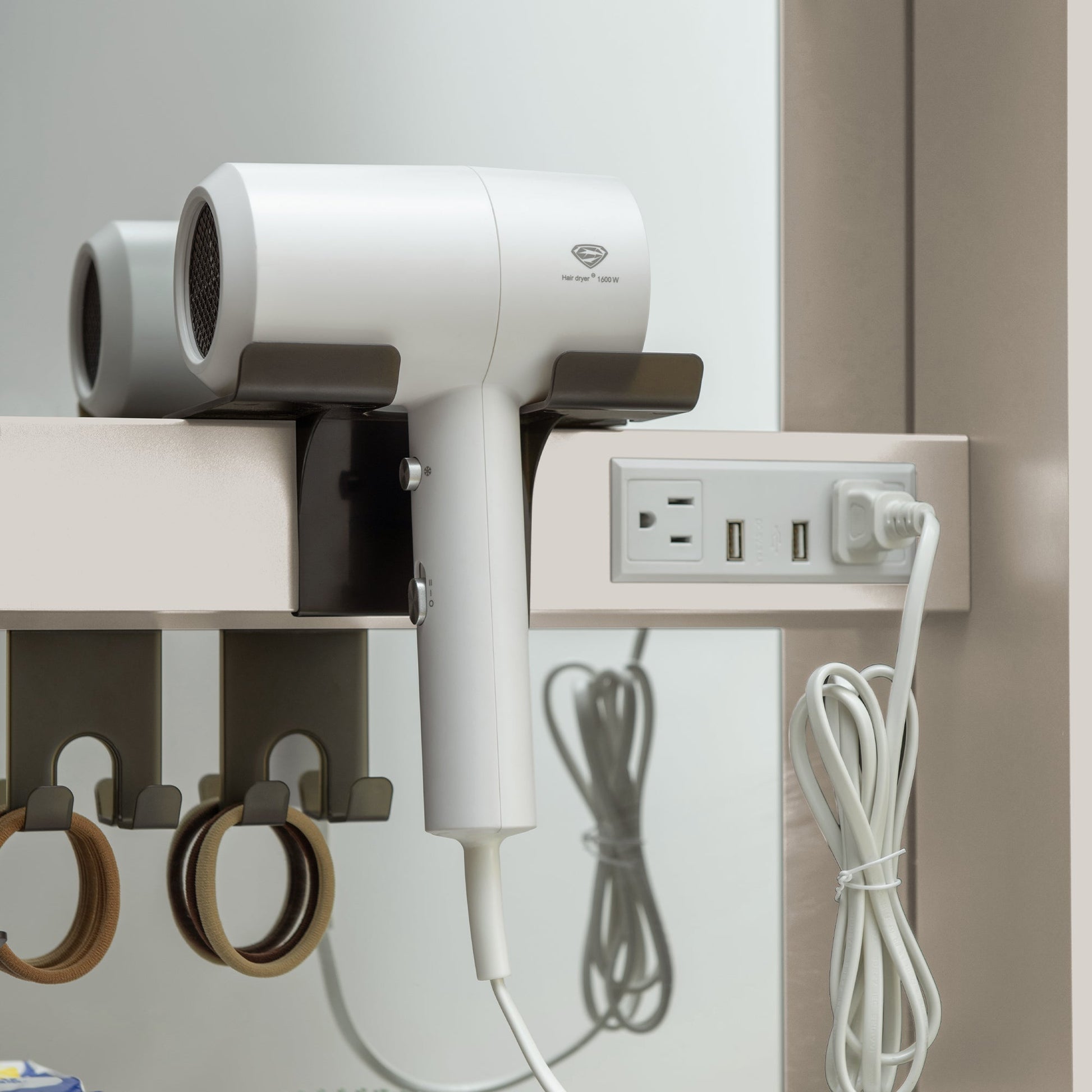 [INTEGRATED POWER]: USB ports and outlets for razors, hairdryers, and devices.