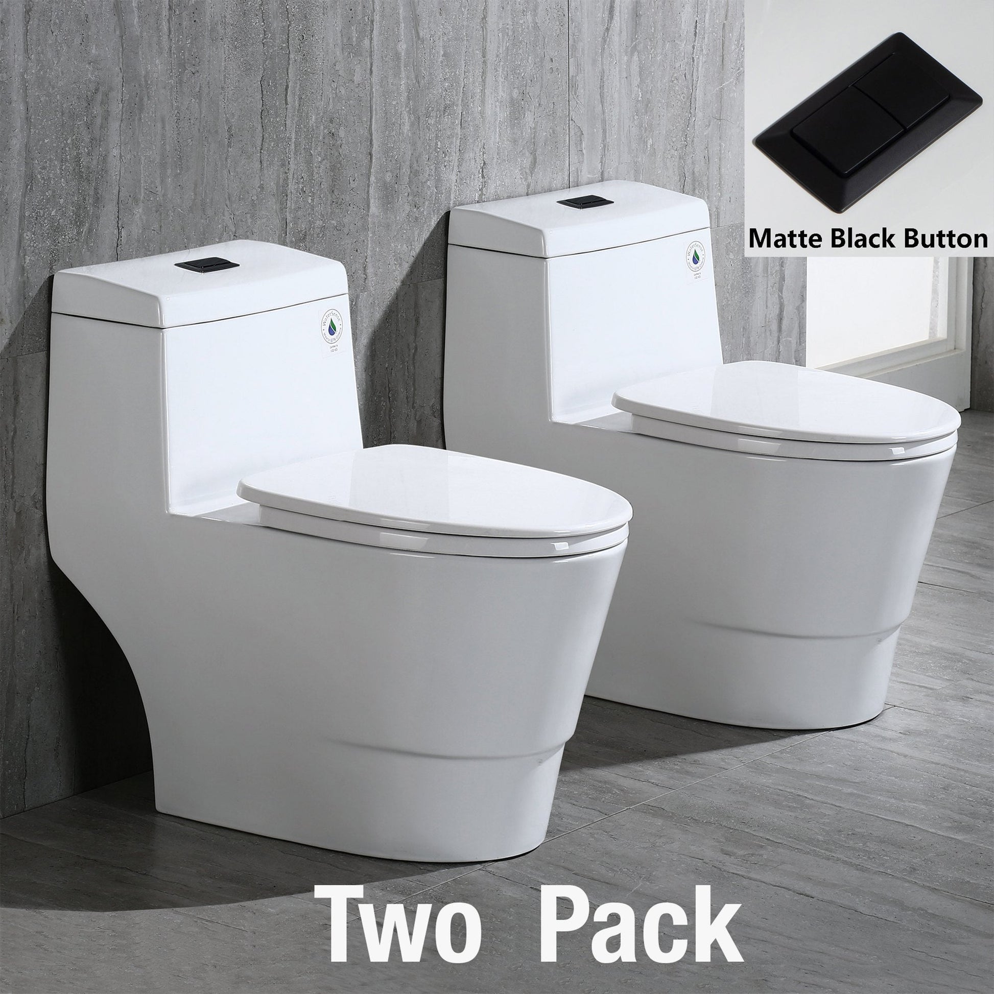 WOODBRIDGE One Piece, 1.28 GPF Dual, Chair Height, Water Sensed, 1000 Gram MaP Flushing Score Toilet with Matte Black Button, White (2 -Pack)