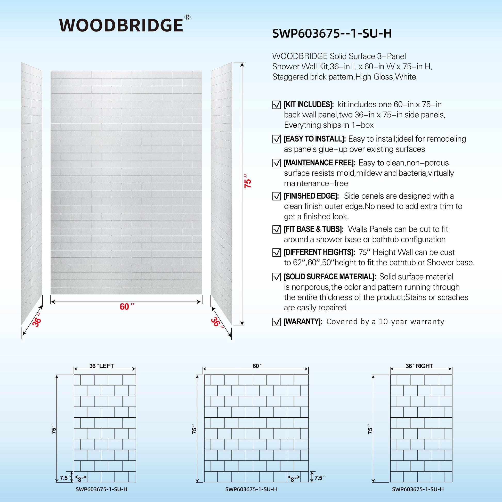 WOODBRIDGE Solid Surface 60" W x 75" H Tile Tub and Shower Wall Panel Surround, Quick Install, Cuttable, Staggered Brick Pattern