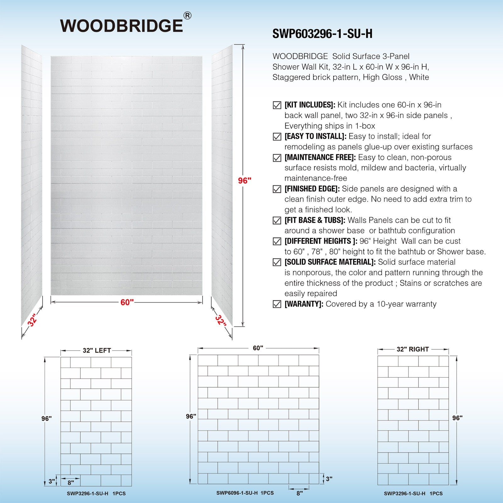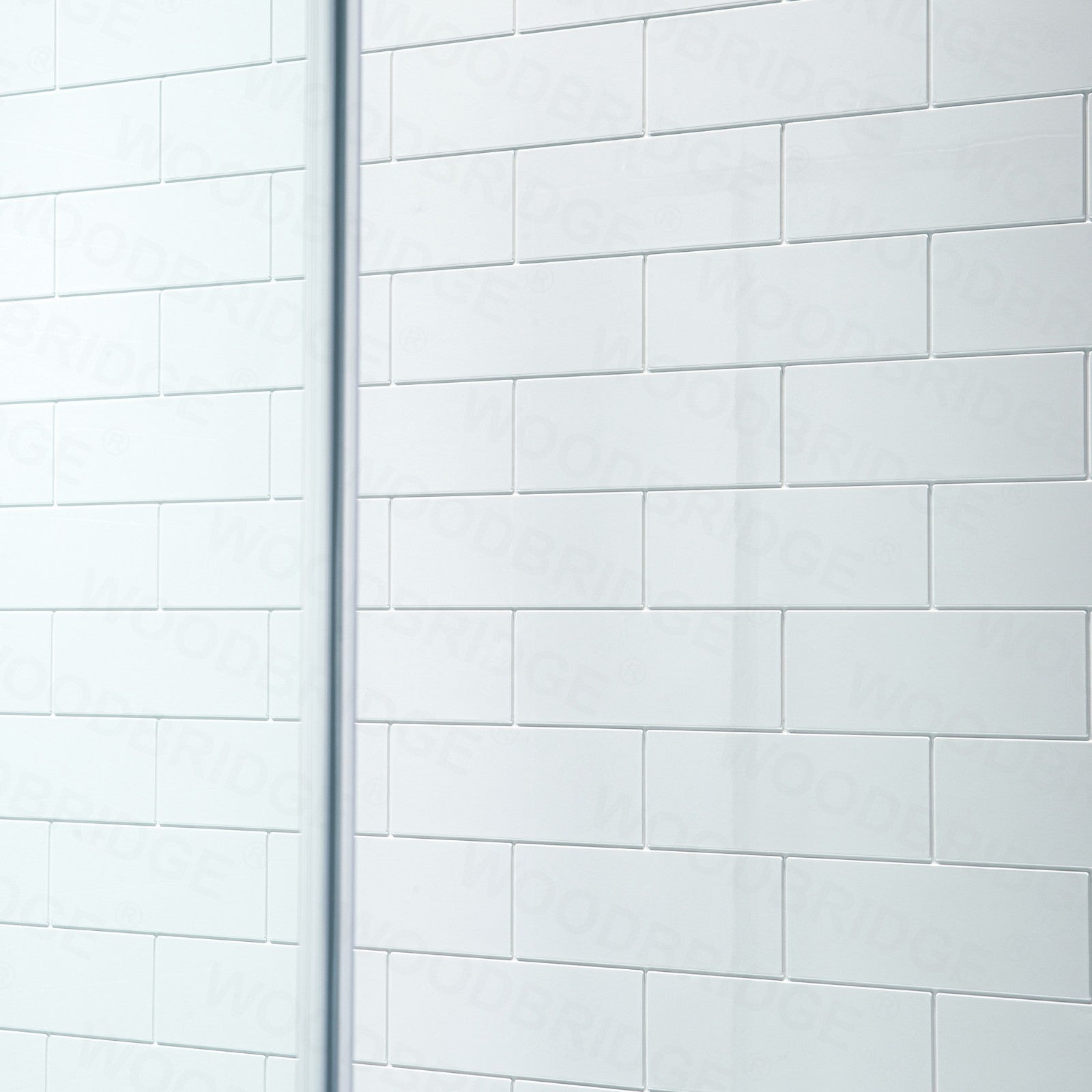 WOODBRIDGE Solid Surface 60" W x 96" H Tile Tub and Shower Wall Panel Surround, Quick Install, Cuttable, Staggered Brick Pattern