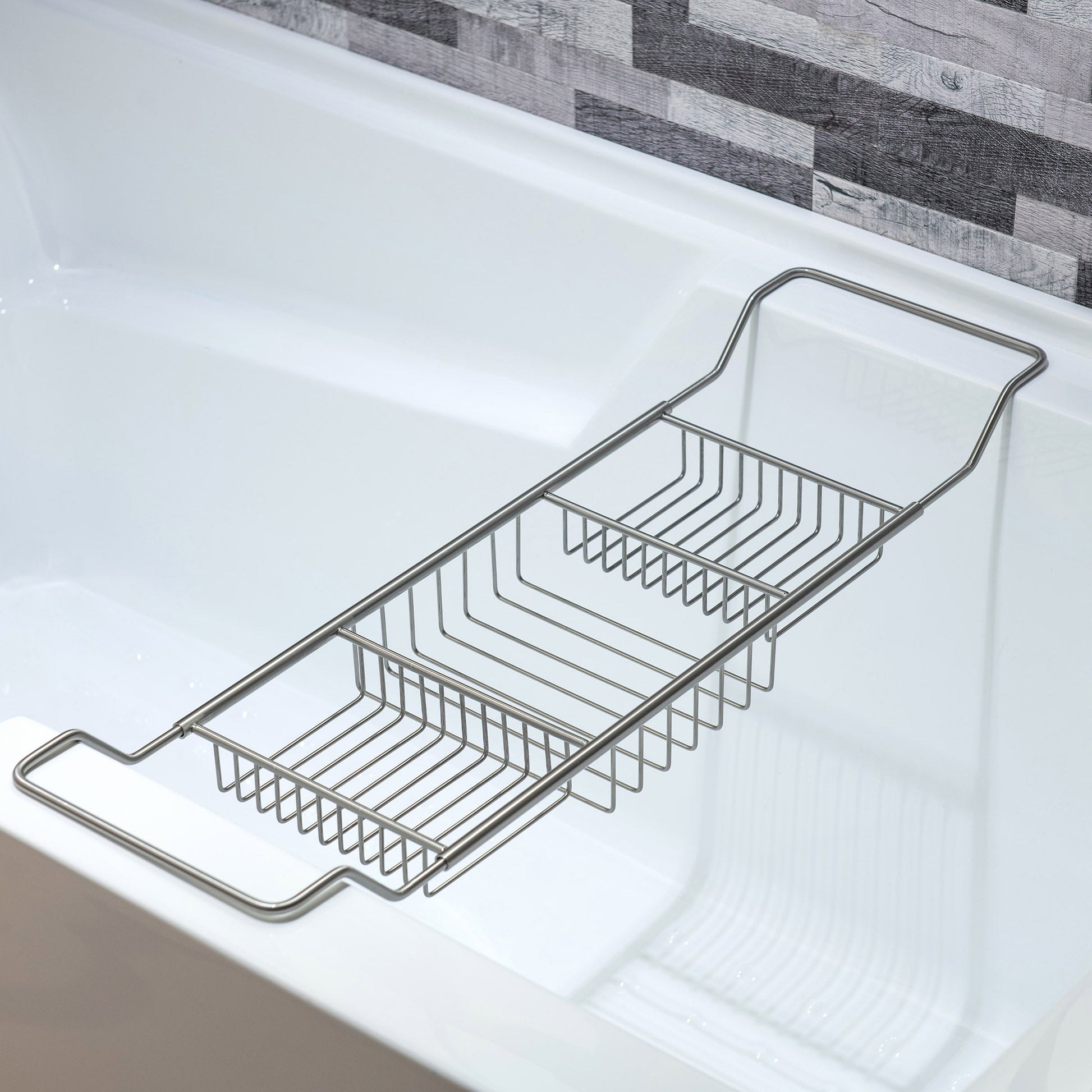 [EXTENDABLE TO SIZES]: Measure 25"L x 7-3/4"W x 1-4/5"H, this tub caddy tray is compatible with most bathtub models, shelf adjusts from 25" wide to maximum 34" wide, work well with most bathtubs, both Two Sides can be Stretched and Pulled back.