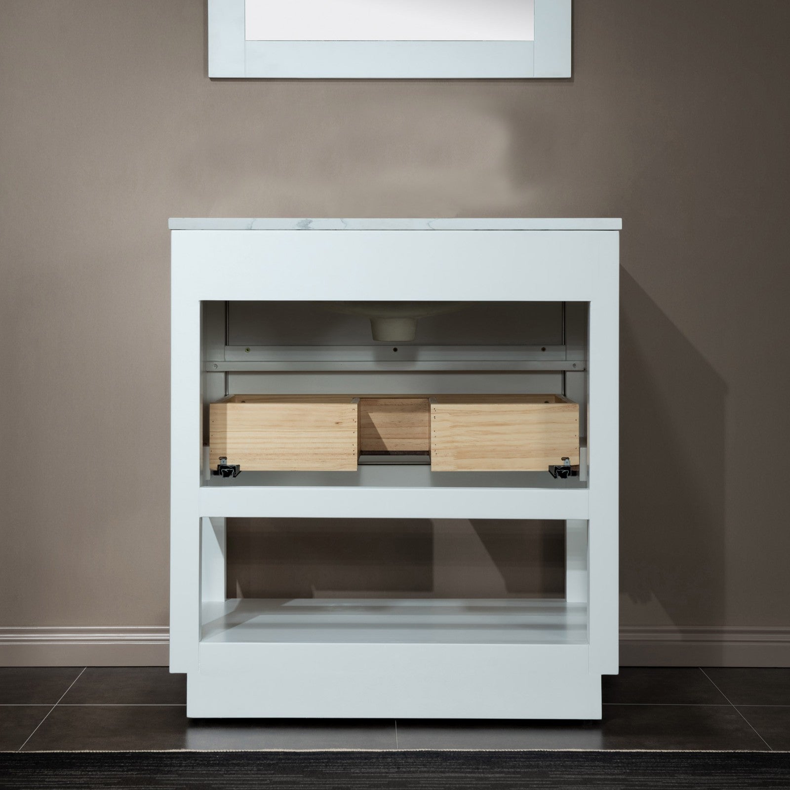 WOODBRIDGE Venice 30"x21"x33" Solid Wood Bath Vanities Side Cabinet in White with Brushed Nickel Trim and Engineered Stone Composite Vanity Top in Carrara White 3 Pre-Drilled Holes for 8-inch Widespread Faucet.
