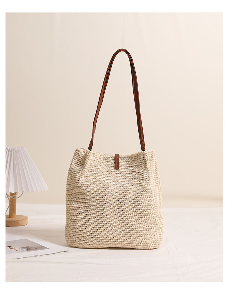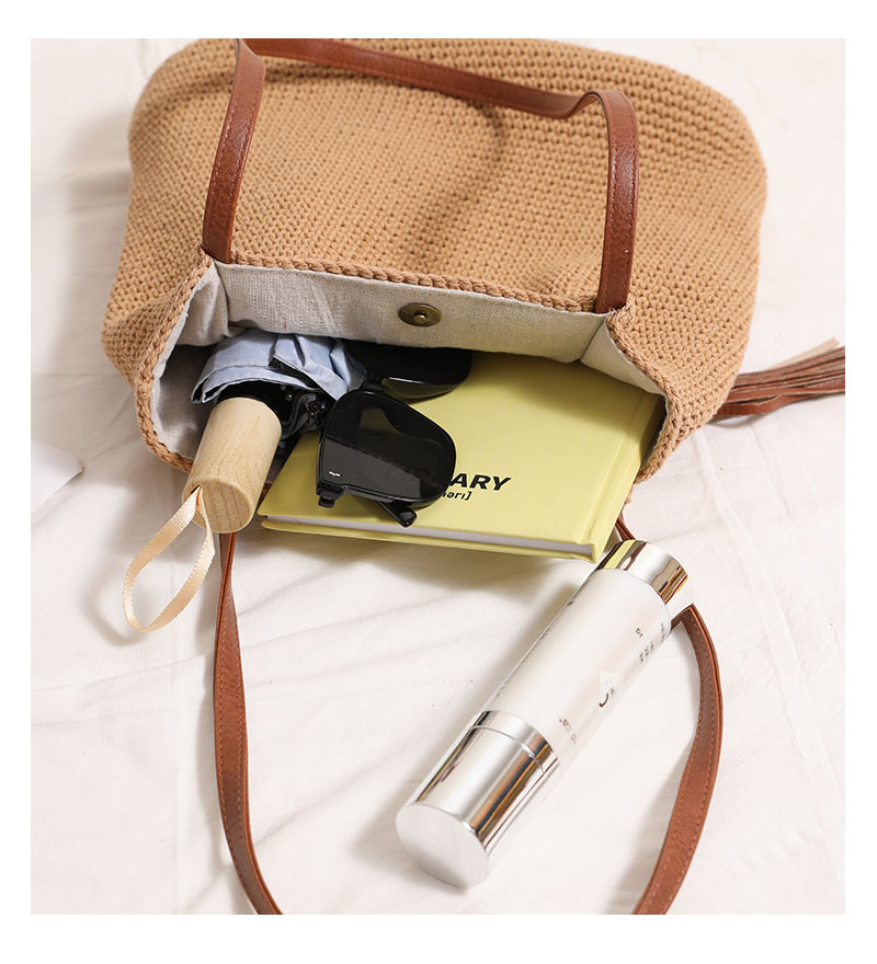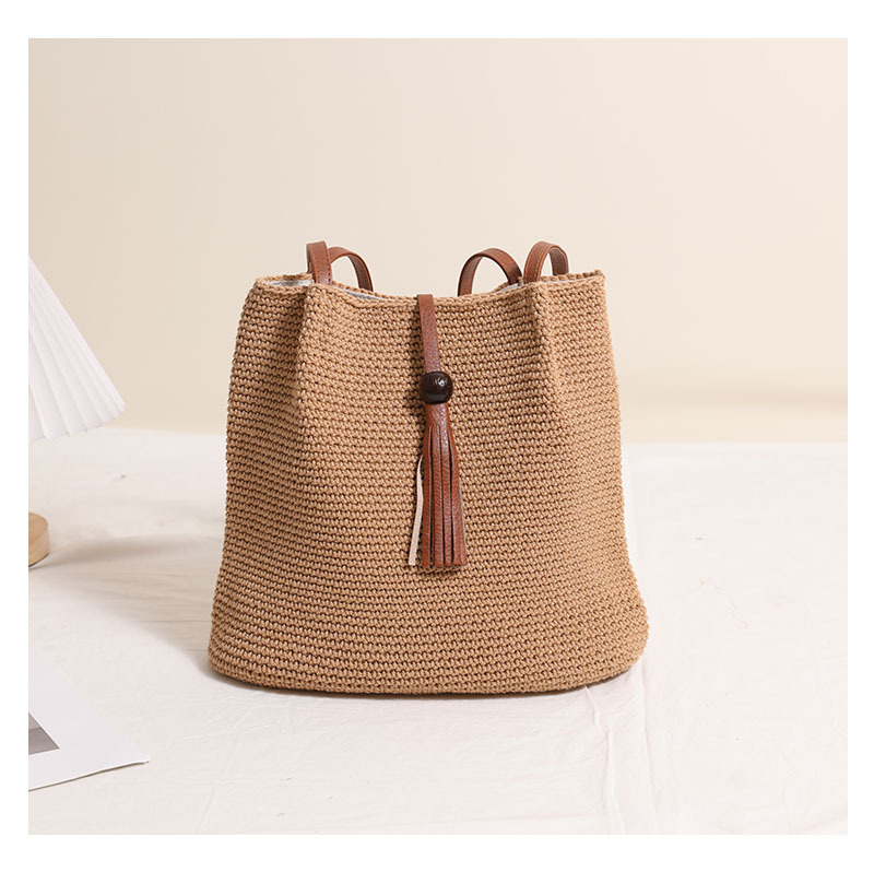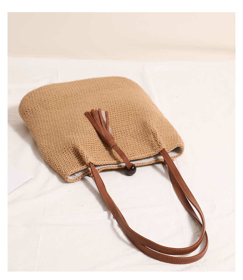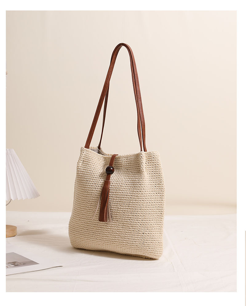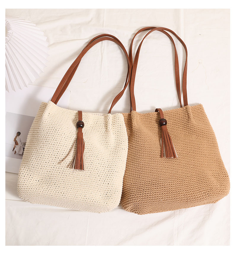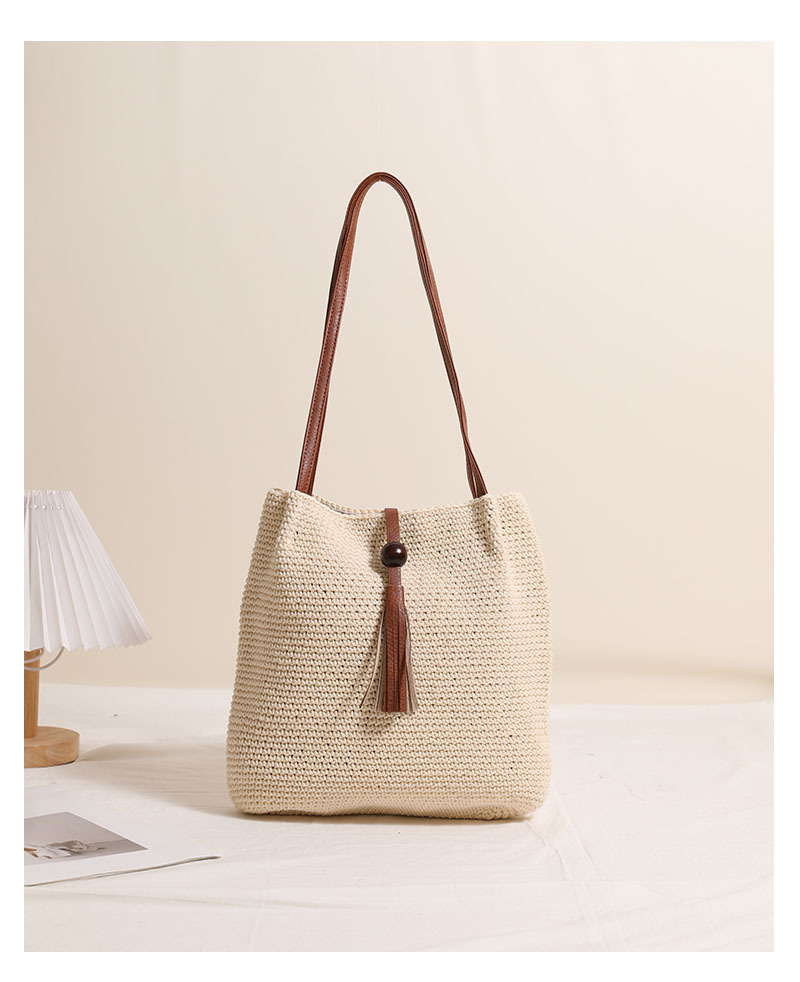 Wooden Bead Tassel Shoulder Cotton Thread Woven Bag Pleated Straw Bag Vacation Beach Bag Women Bag