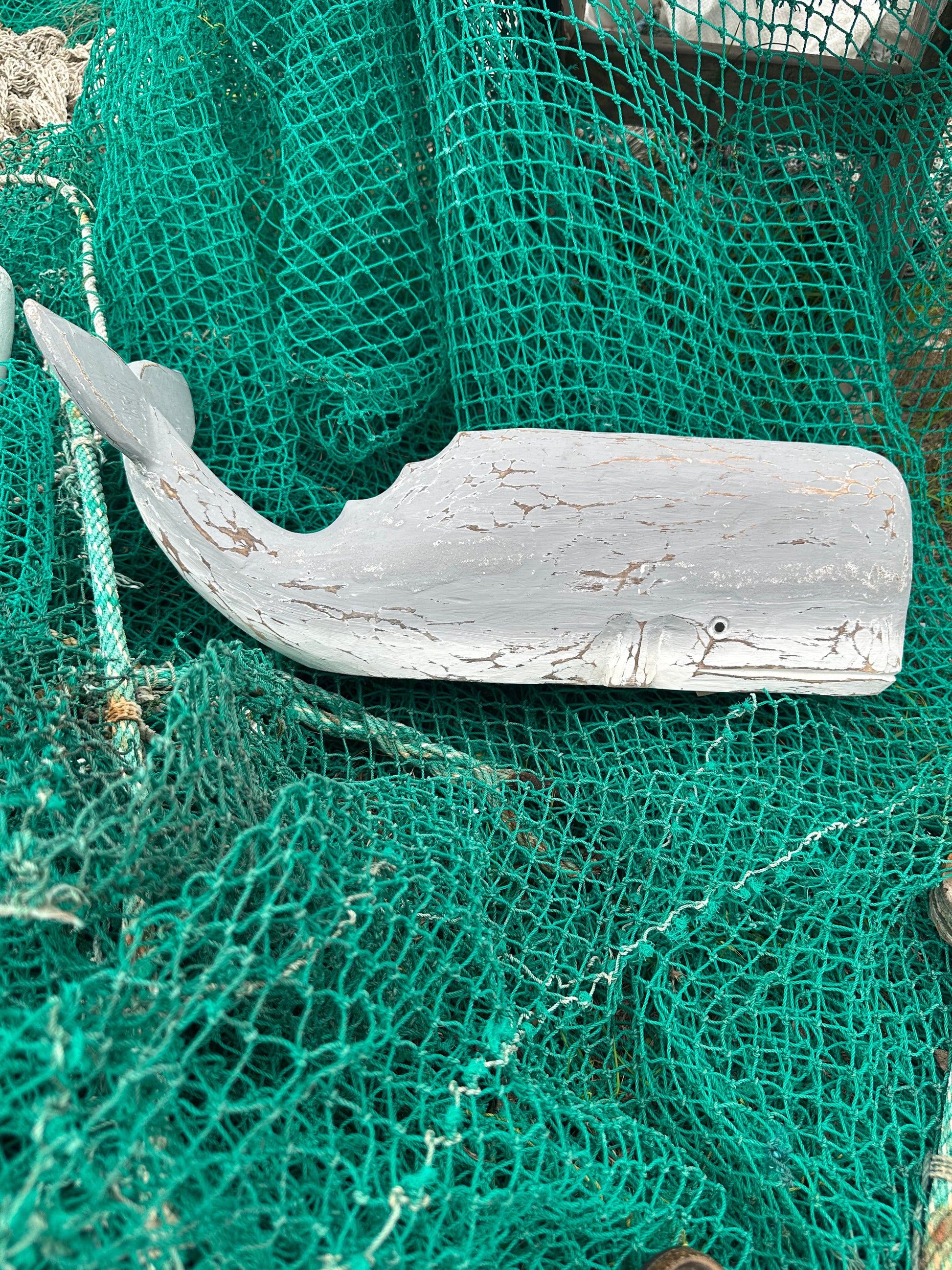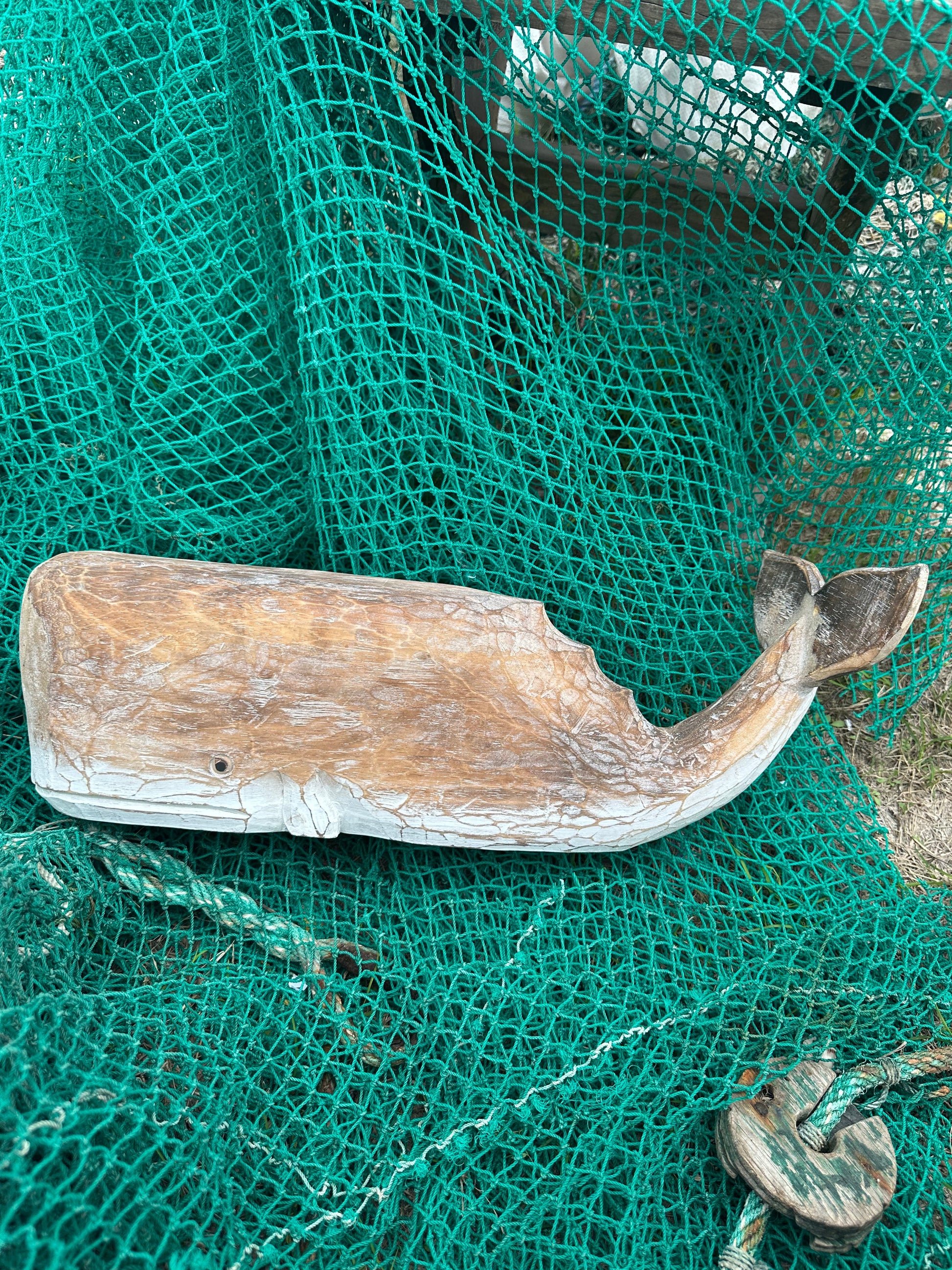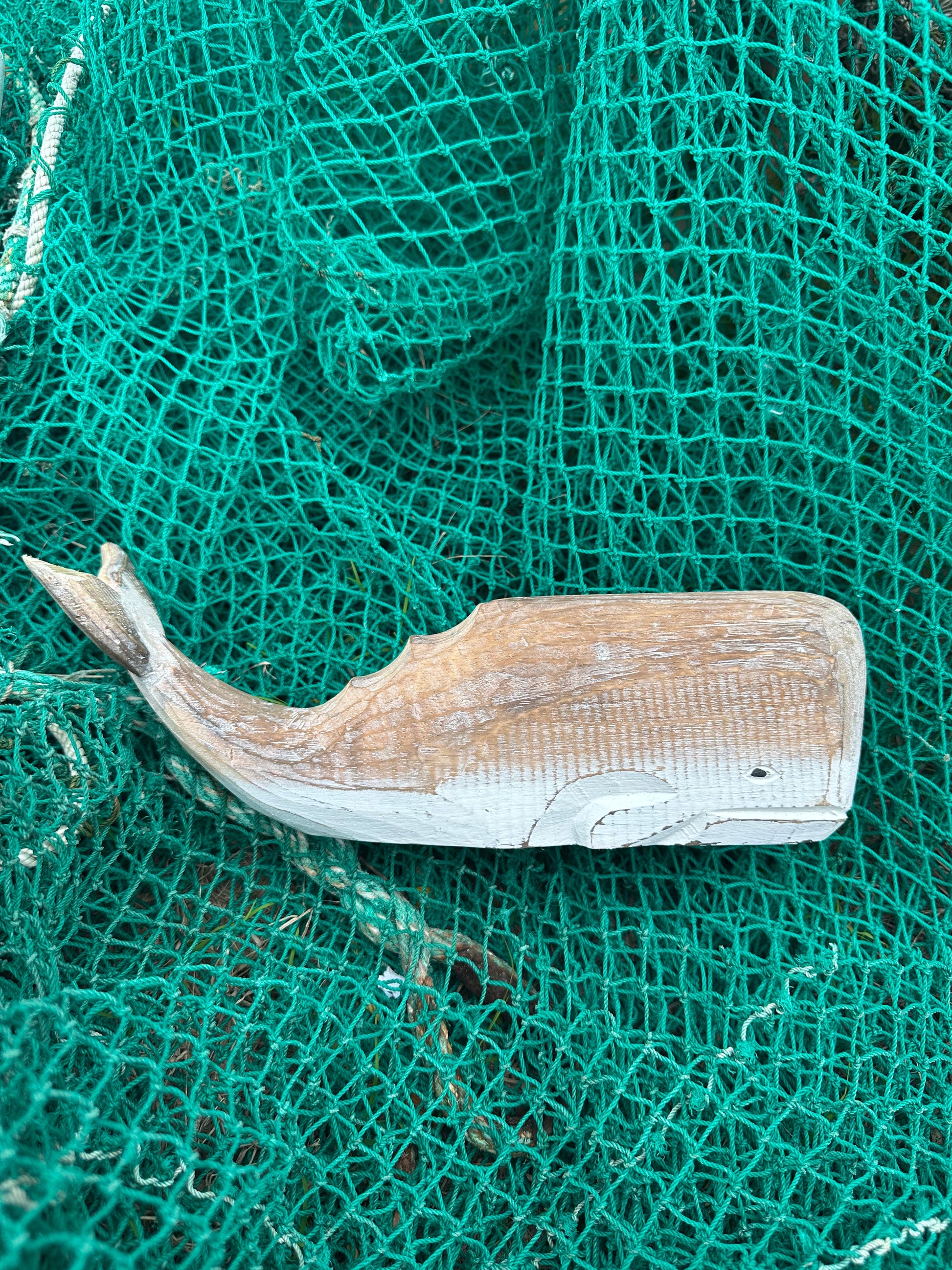 - Design: Stylized whale shape with a smooth, weathered look