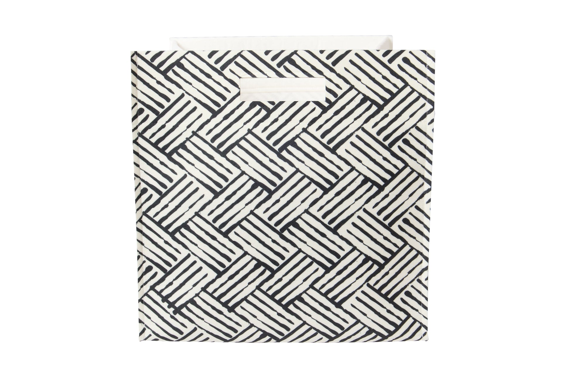 Eco-friendly storage bin made from a sturdy thick felt featuring a hand-drawn pattern digitally printed in black. This 12" x 12" storage bin is perfect for home organizing and is made to fit in cubby style shelving. The front, bottom, and back of the bin are printed with a fun pattern while the two sides are a clean white. Front and back handles make it easy to pull bin out from shelving.