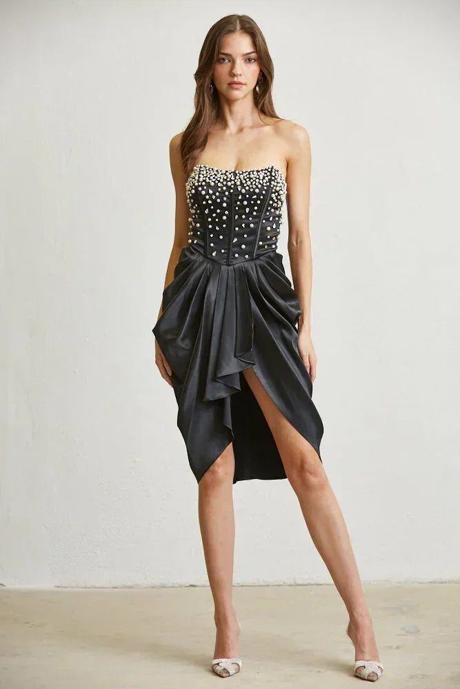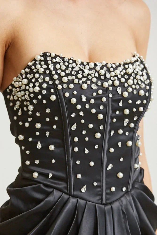 DRESS- LUXE SATIN FABRIC- STRAPLESS BODICE- CORSET BODICE WITH BONING- ALLOVER PEARL RHINESTONE DETAILING- PLEATED SKIRT- HIGH-LOW HEM- INVISIBLE ZIPPER BACK- 100% POLYESTER