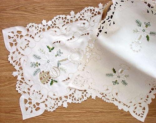 Exquisite embroidery of Christmas candles are the centerpiece on this cutwork table runner. Golden lycra accents give this runner the warm glom of a magical holiday evening.