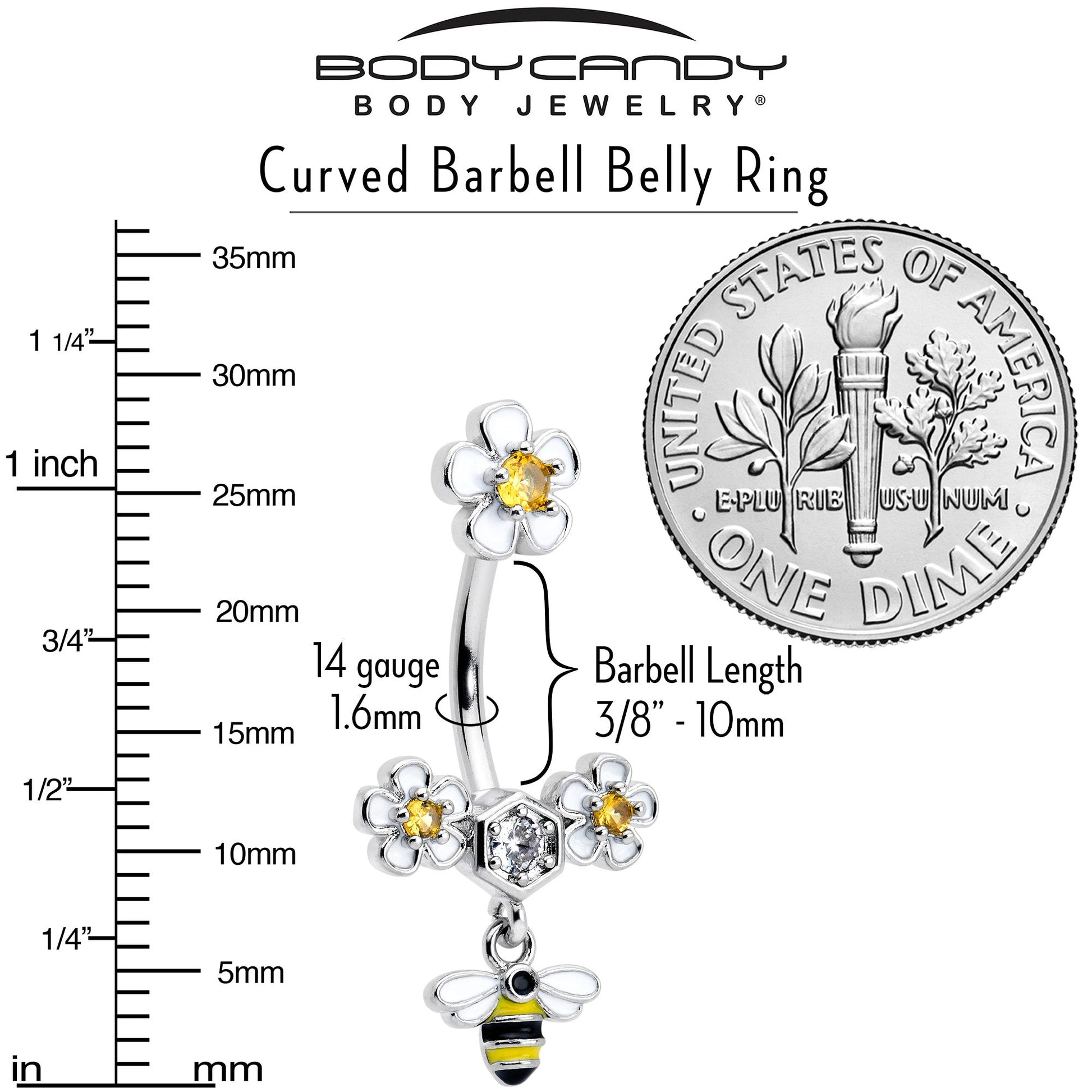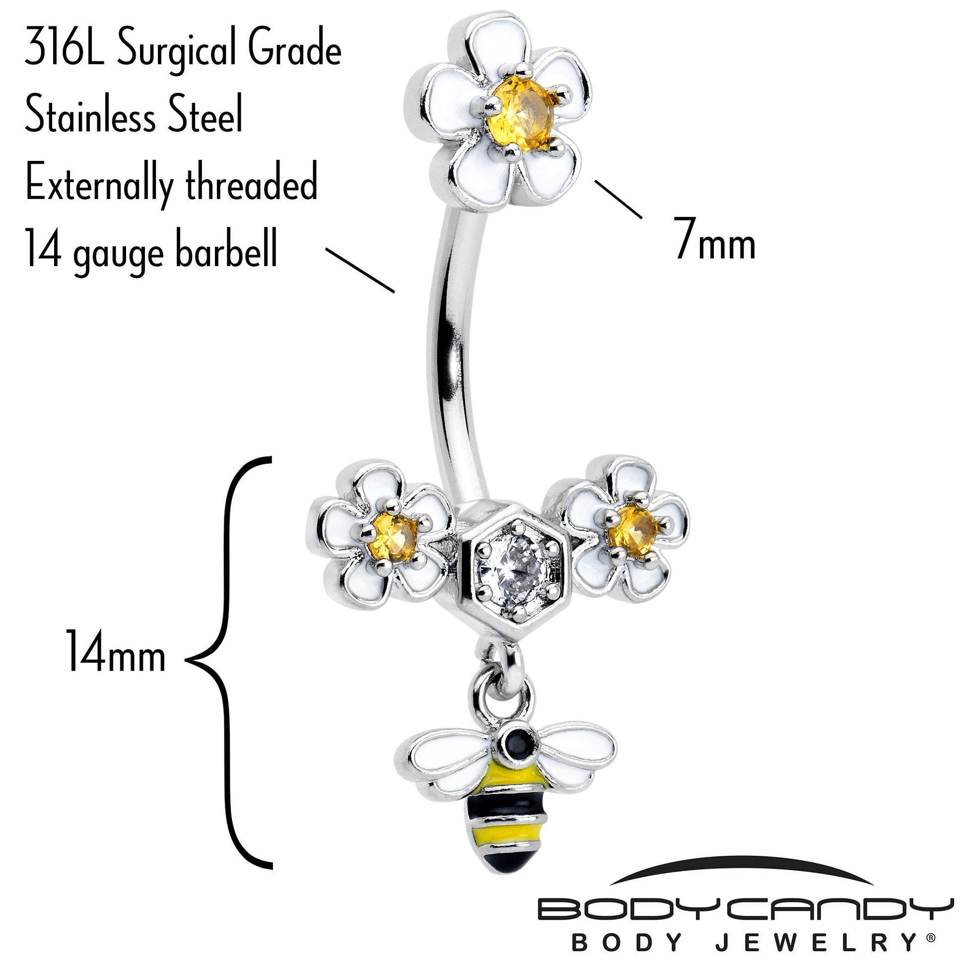 You'll bee the hottest bee in the hive with this 14 gauge navel ring. It's made with a 3/8 inch 316L surgical grade stainless steel curved barbell. The top end features a flower charm with white petals and a yellow cubic zirconia gem center. The bottom end features a pair of matching flowers on each side of a single honeycomb charm with a clear cubic zirconia gem center. Dangling beneath is a bee charm with black and yellow stripes and white wings for a cohesive appearance. Whether you're a worker, a drone, or the queen, you'll be the sweetest looking honey in the room with this elegant honeybee belly piercing jewelry.Specifications