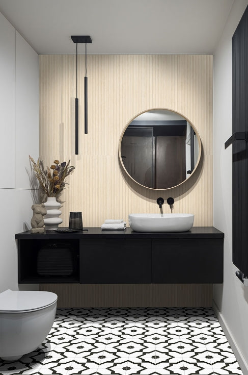 Elevate your decor with the stunning Gia Encaustic Tile from our Zaria Collection. Boasting a modern, flower-like geometric pattern in black and white, these tiles are the perfect complement to any style. Each tile is meticulously handcrafted and seamlessly aligns with others to create a larger, cohesive design. Plus, they're durable, easy to clean, and require no ongoing maintenance, making them ideal for high-traffic areas like countertops, floors, walls, and backsplashes. Upgrade your home with the Gia Porcelain Tile today.