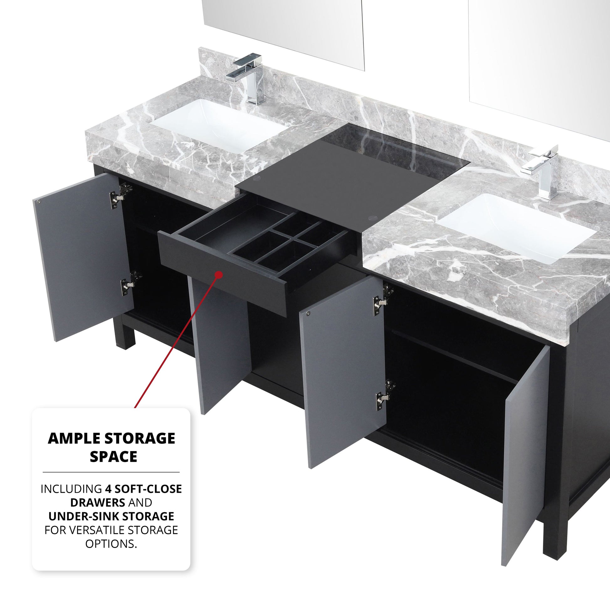 - Double sink vanity with under sink storage and four drawers