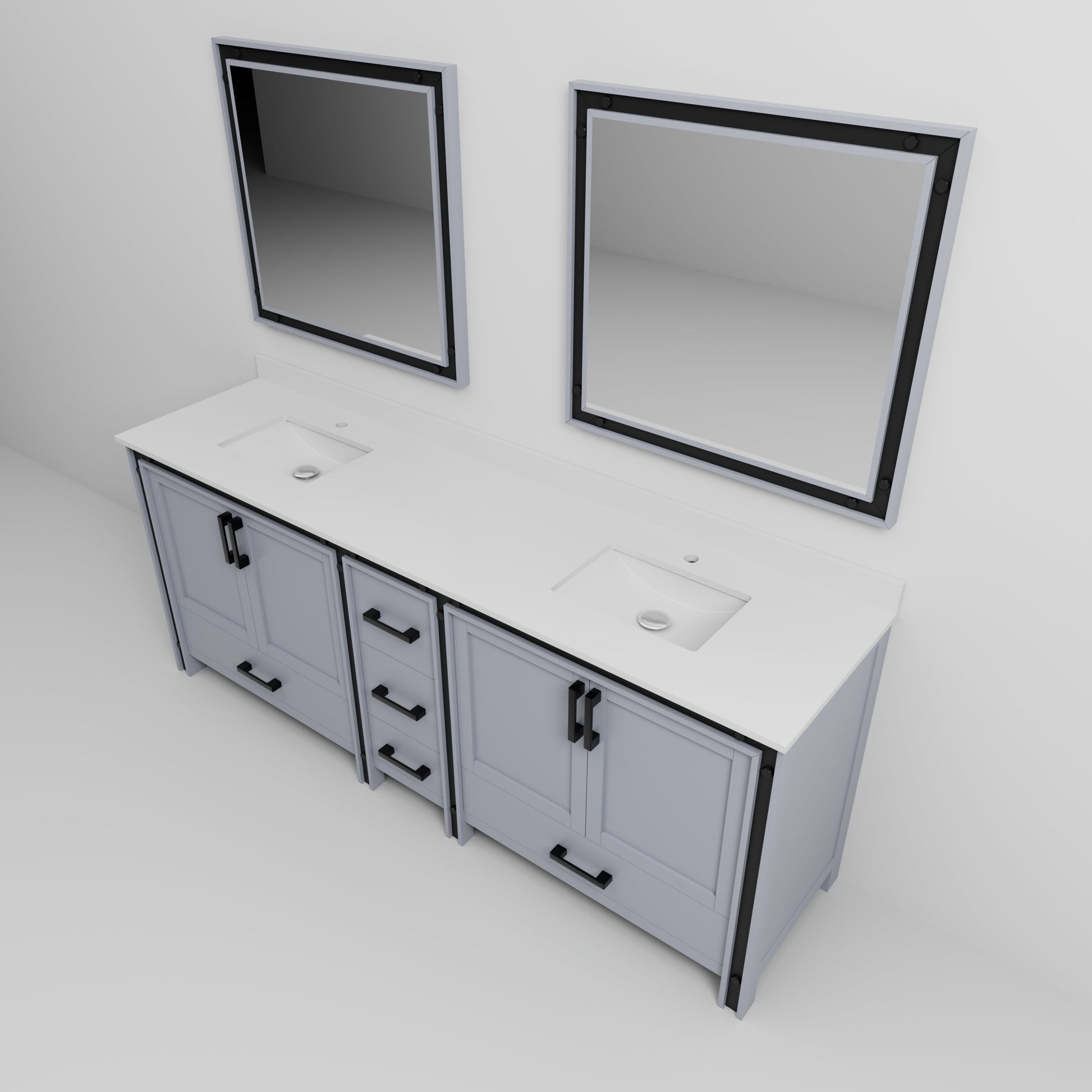 - Sleek bathroom vanity available in a variety of finishes, including White, Dark Grey, and Rustic Barnwood, with matte black hardware included