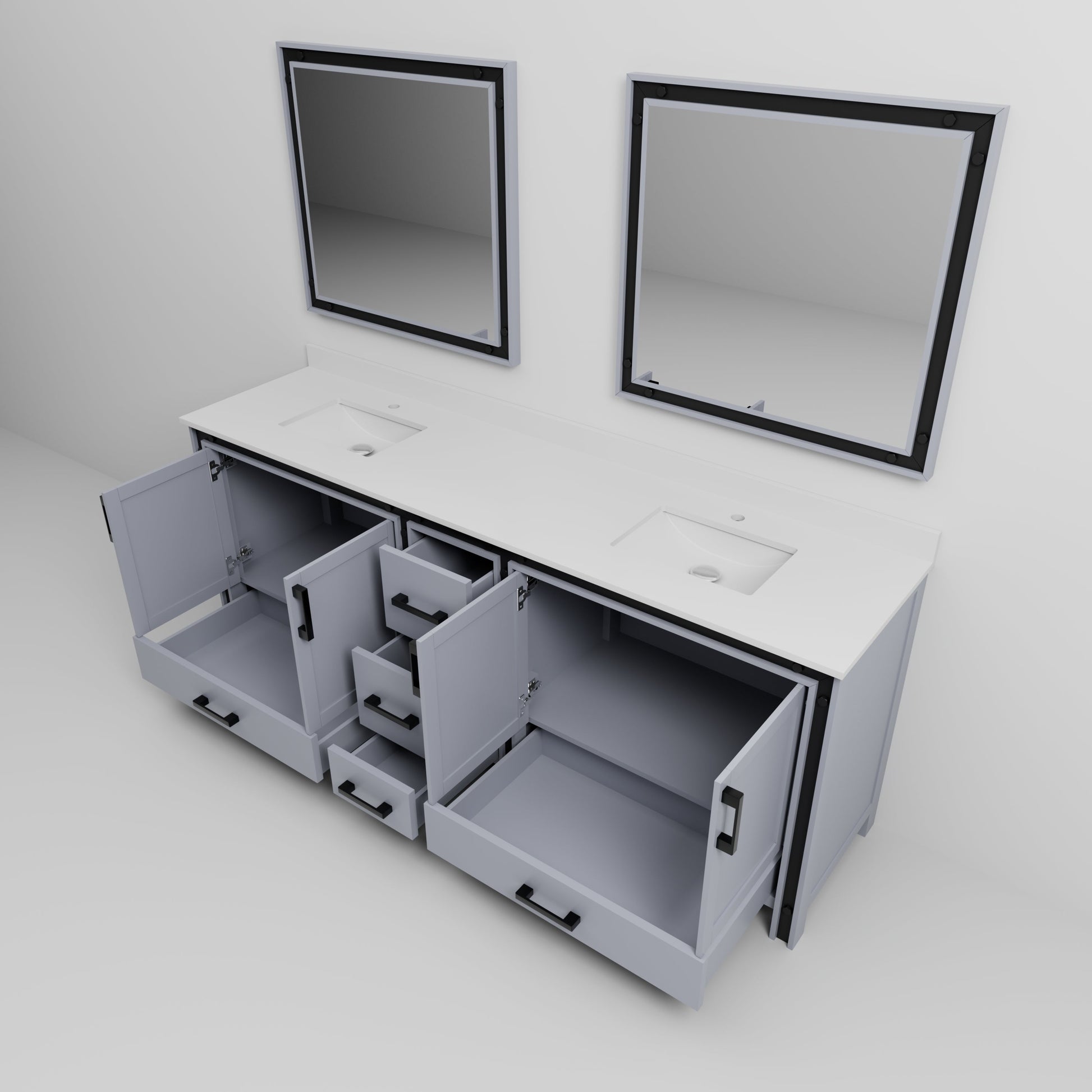 - Double sink vanity with under sink storage and five drawers